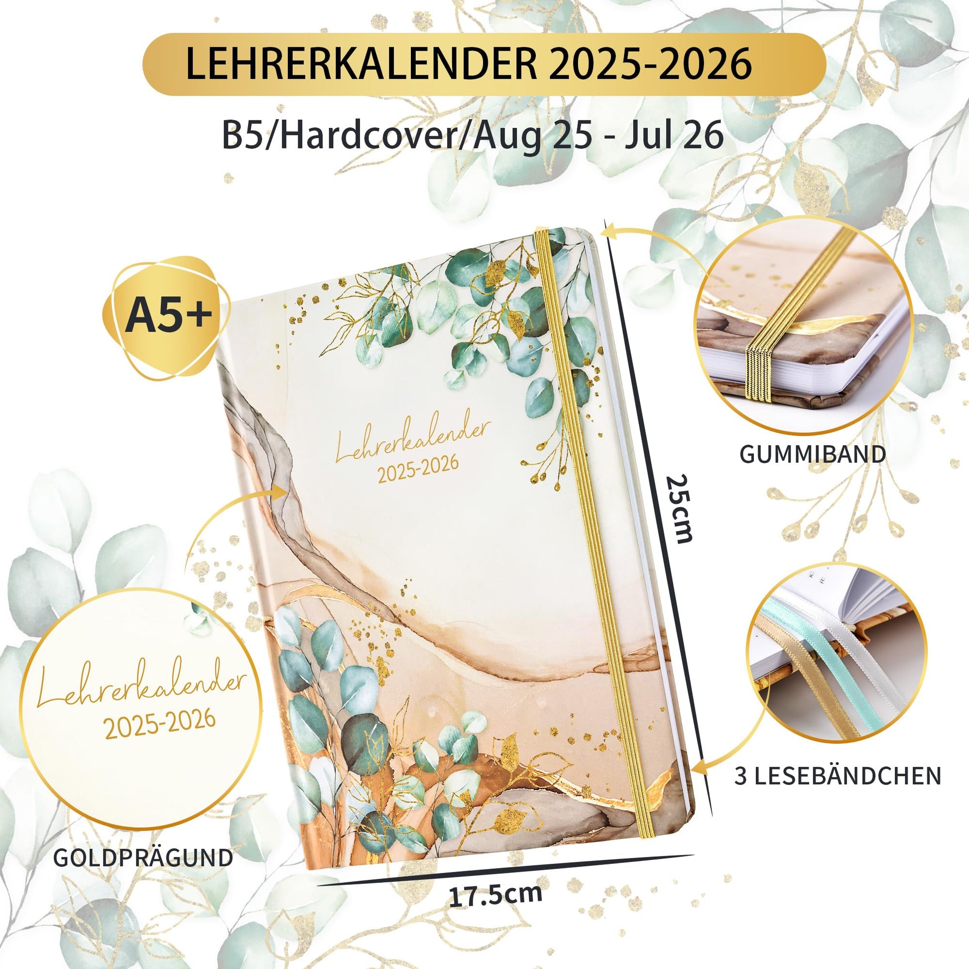CAREFUL DESIGN: The sturdy hardcover in 17.5 x 25 cm that is not easily bent and easy to wipe, Elastic band for closure & noble cover embossing in gold, Make this teacher planner look more elegant and convenient to use, 3 bookmarks for organization allows us to quickly navigate.