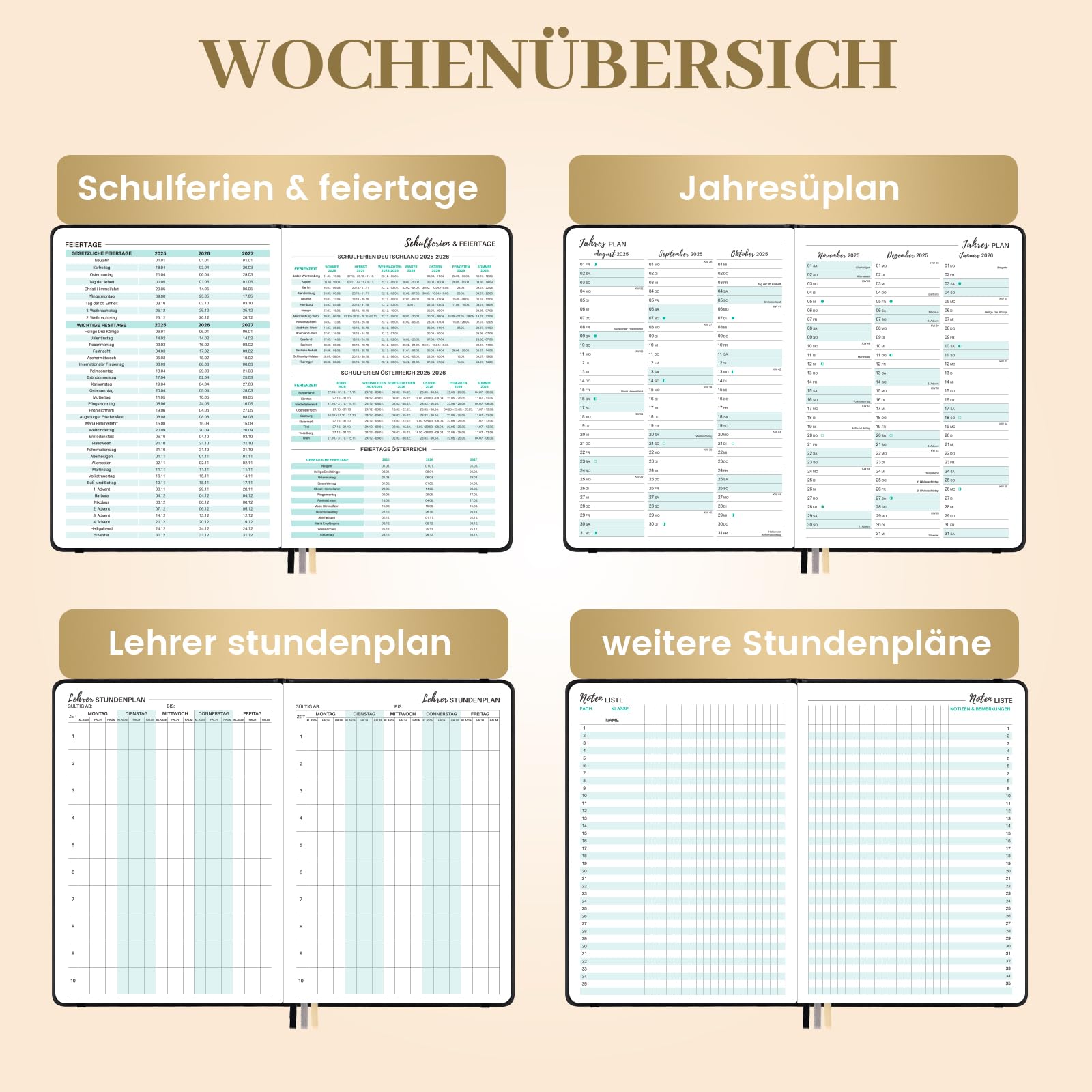 "π FEATURES: 2025-2027 school holidays & holidays for Germany & Austria + monthly overviews and yearly overview from August 2025 to July 2026 + teacher schedule + notes list + notes + class list and much more!",