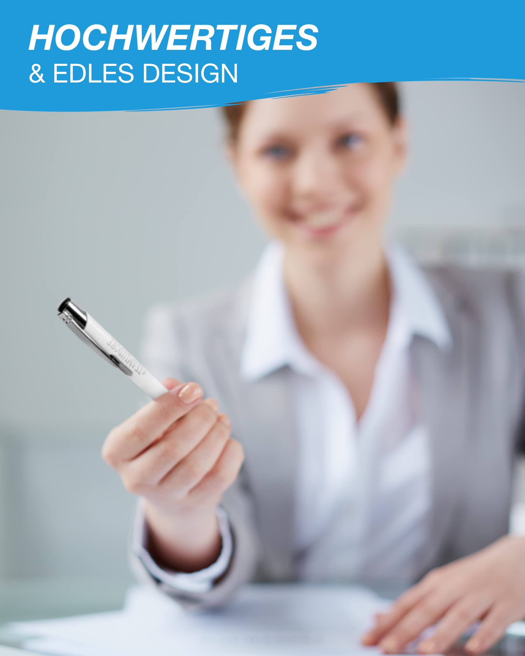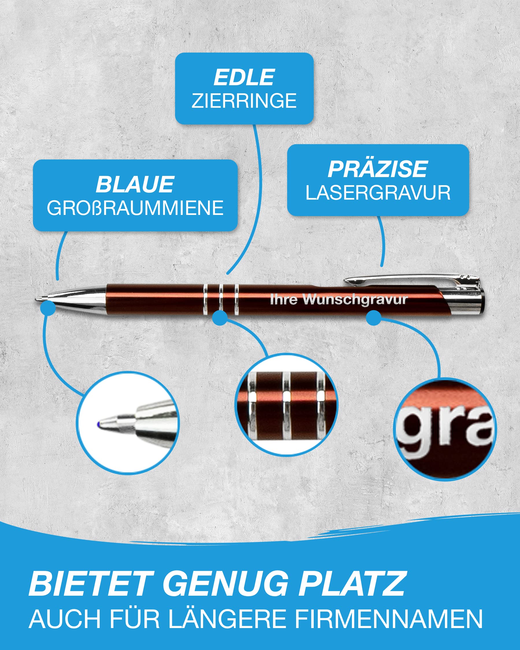 ["π PERSONALIZATION: Our high-quality metal ballpoint pens with custom engraving are available in various quantities, 14 colors, & 20 fonts, making them individually customizable.","π IDEAL WEARABLES: Our pens are ideal as promotional ballpoint pens for companies, businesses, clubs & organizations, or as a gift with a unique name engraving.","π CUSTOMERS & PARTNERS: Ballpoint pens as a great gift idea for customers at events, trade shows & fairs, for employees, as a thank you, guest gift at weddings & celebrations, or as a farewell gift.","π LASTING ENGRAVING: The waterproof 14 cm ballpoint pens are engraved with a highly precise laser on an area of ββapprox. 6 x 60 mm & offer enough space for longer company names.","π CUSTOMER CARE: The high-quality pens have a blue jumbo refill made of metal with decorative rings. We place great emphasis on your satisfaction & are always available to you for any questions or comments."]