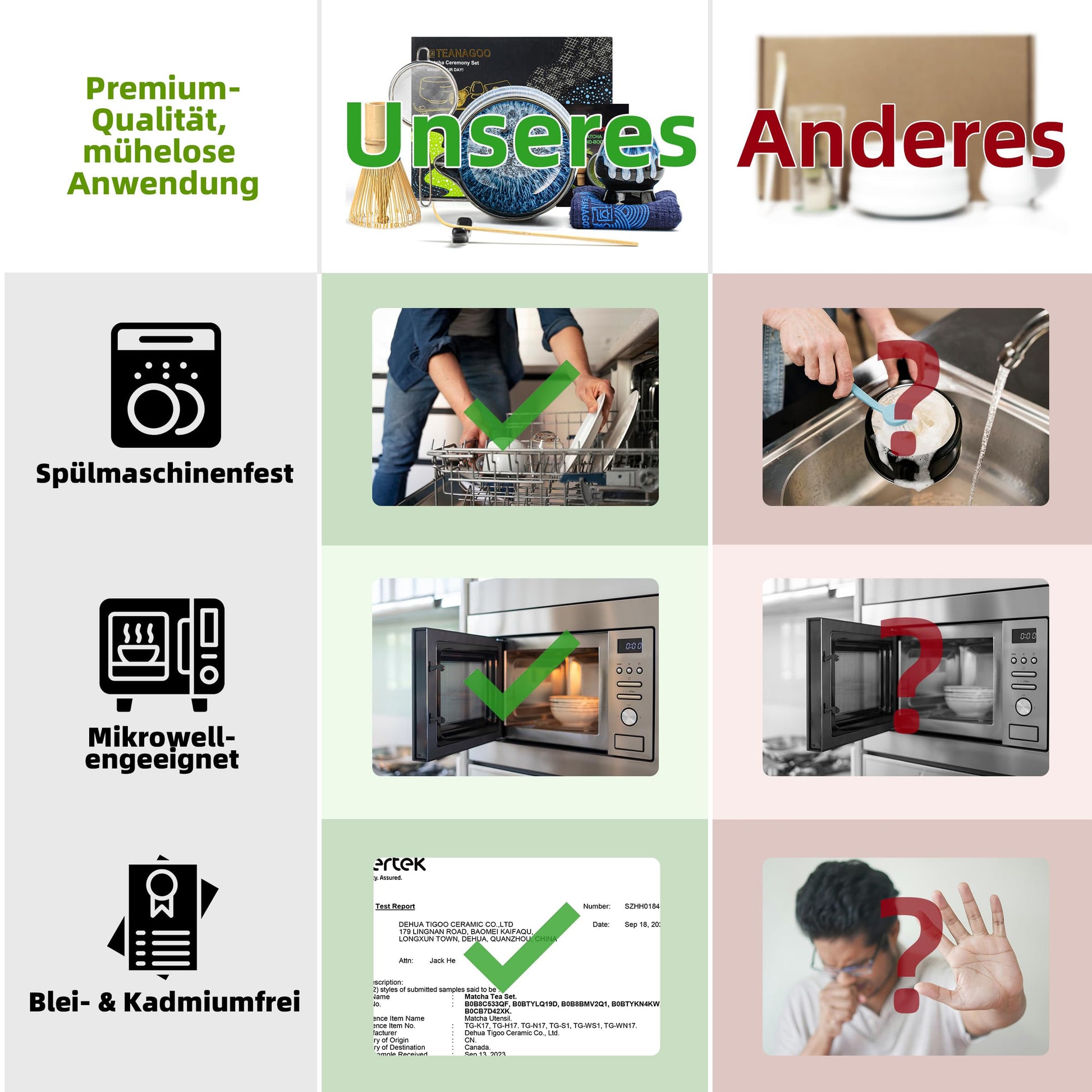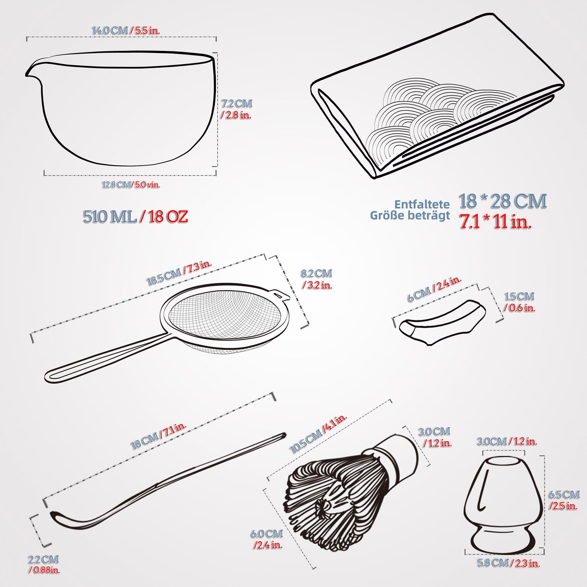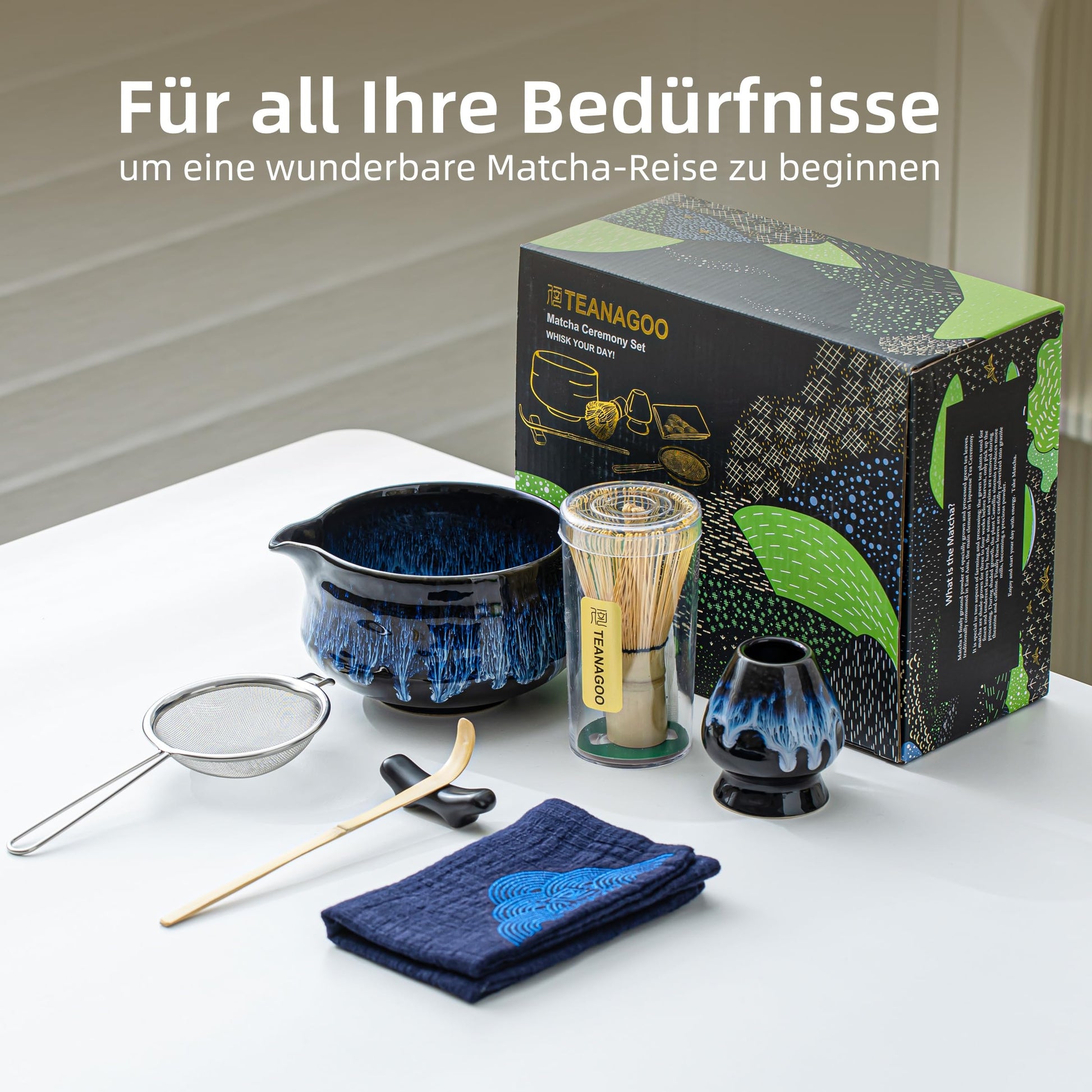 ["7-piece Matcha Whisk Set in blue: 1 x Ceramic Bowl (Chawan) 17.2 fl oz, 1 x Bamboo Whisk, 1 x Bamboo Scoop (Chashaku), 1 x Ceramic Whisk Stand, 1 x Ceramic Scoop Stand, 1 x Cotton Dish Towel (Chakin), 1 x Matcha Powder Sieve. Includes all accessories","High safety and quality: Our handmade Matcha Whisk, approx. 77 fine prongs (100% high-quality bamboo with vegetable oil finish to increase durability. In addition, our ceramic bowl has lead-free and mercury-free test reports. Food safe and environmentally friendly","Great Matcha Set: Our Matcha Set represents health and ceremony. Includes all necessary accessories for a Matcha tea set. A wonderful gift for Matcha lovers. Perfect gift idea for friends and family for birthdays, Mother's Day, Teacher's Day, Valentine's Day, Christmas, etc","Unique Design: Special spout design, easy to share Matcha with friends and family. Matching color for Matcha bowls and whisk stands, enhancing the ceremonial feel","Enjoy the fun of making Matcha: Perfect for creating healthy breakfast drinks like Matcha Latte, Matcha Milk in the morning. Use your practical skills and enjoy the process. Suitable for home or office"]