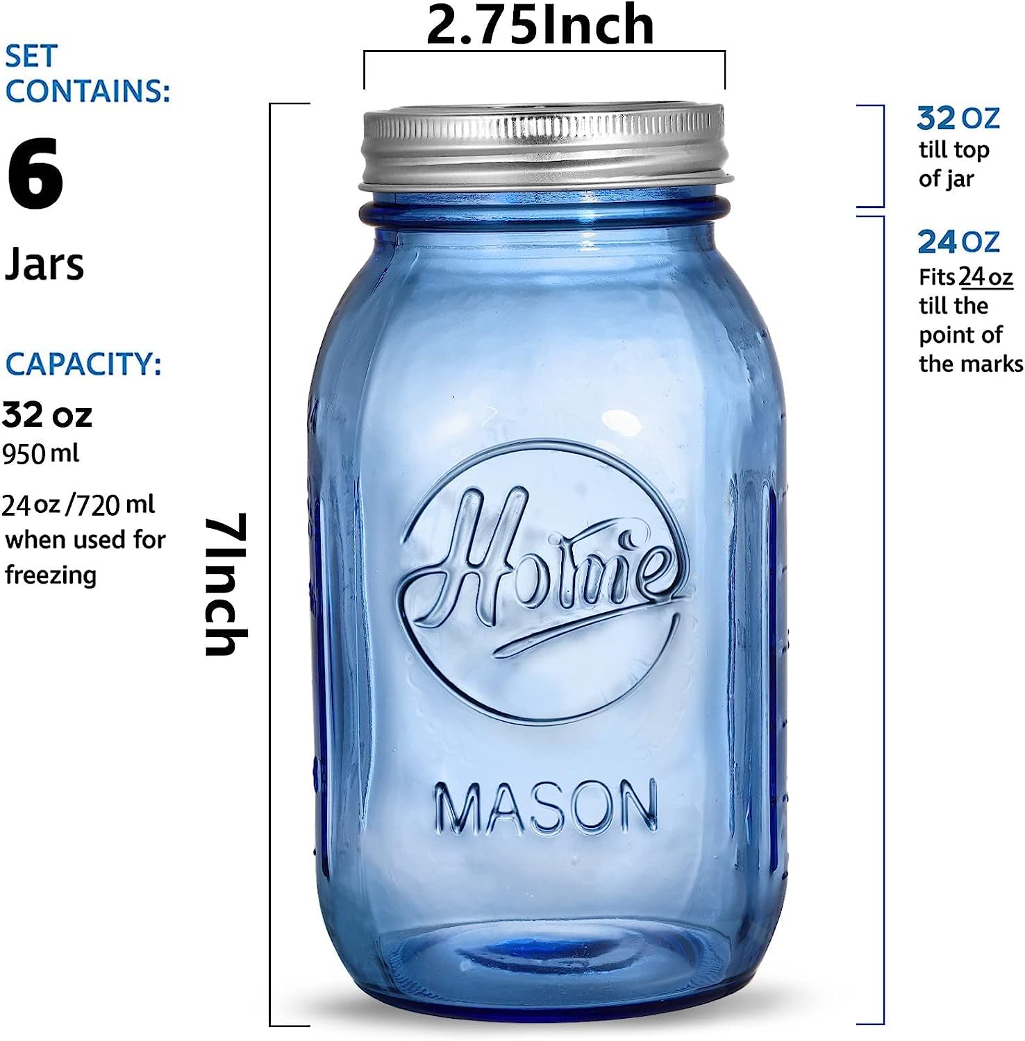 Tebery 6 Pack 32oz Blue Mason Jars with airtight lids & bands, 1 Liter Regular Mouth Quart Glass Canning Jar for fermenting, pickling, storage, DIY crafts & decoration.
