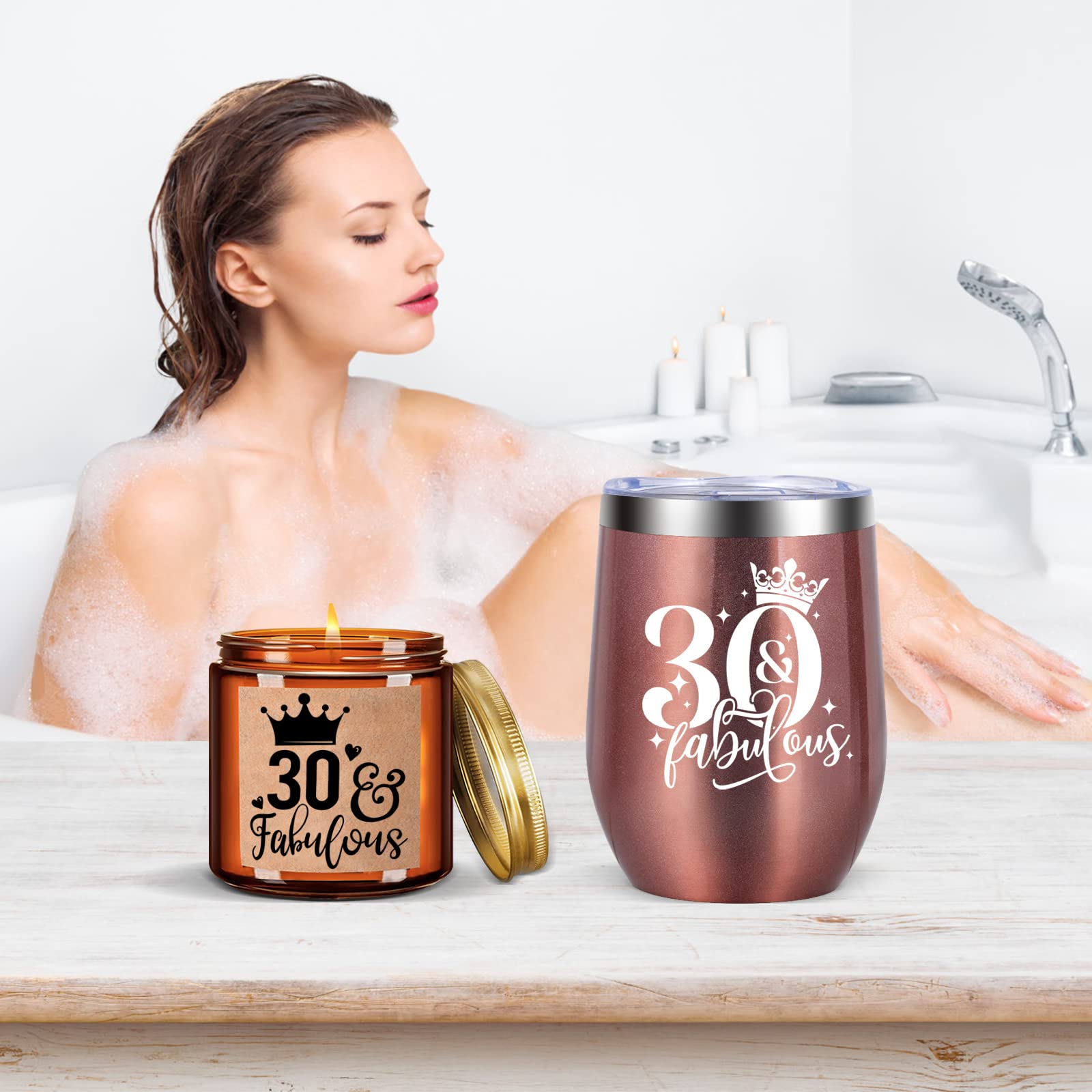 "Practical gift baskets for 30th birthdays: Celebrate the 30th birthday with wine glass, cheer 30 fabulous years with this keychain, enjoy bath time with long-lasting luxury scented candles, warm your feet with comfy cotton socks, daily makeup with rose gold mirror. A memorable 30th birthday gift is sure to bring a big smile to her face!"