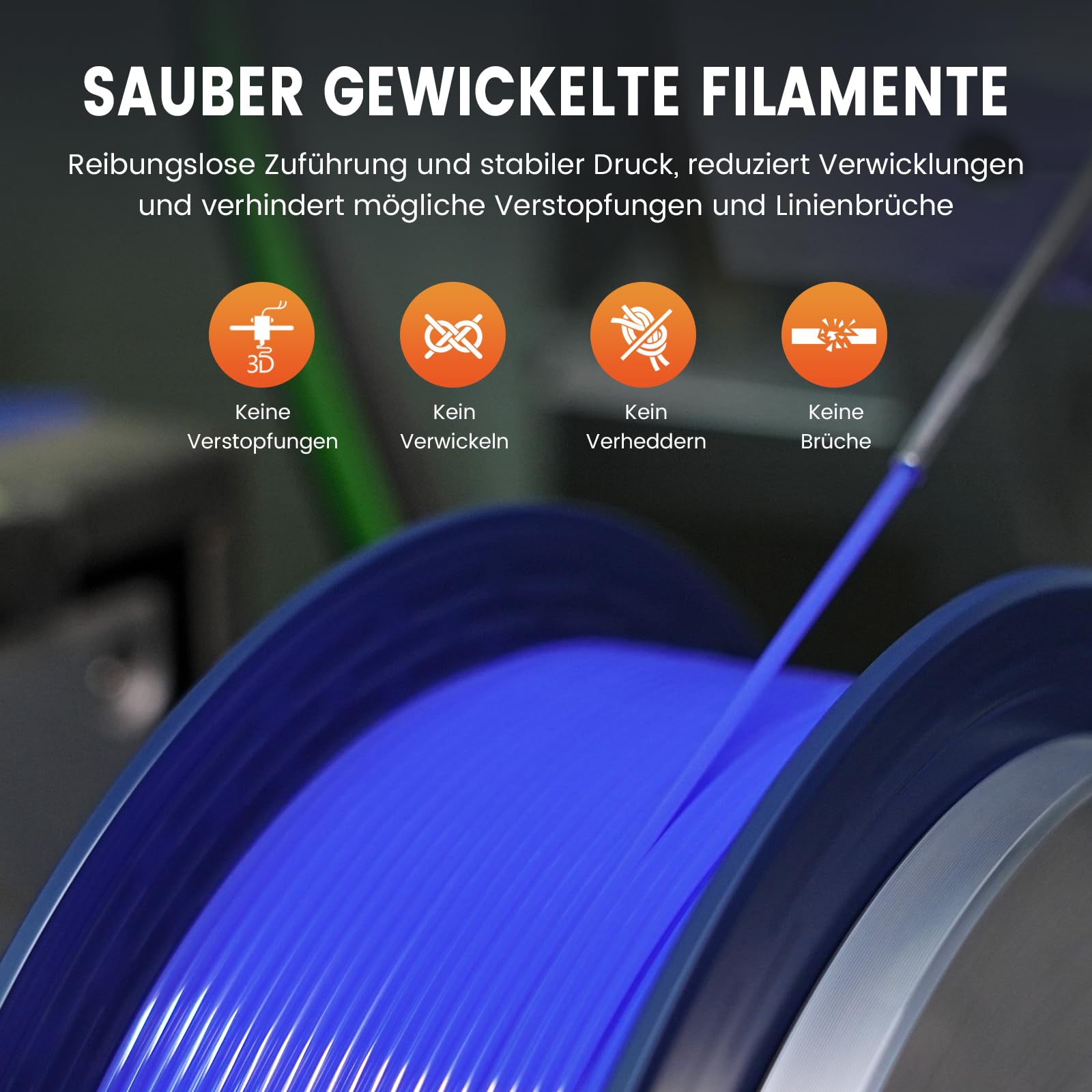 TANGLE-FREE WINDING: With a total length of 330m, the PLA+ filament is neatly wound to minimize tangles and line breaks. Includes filament string clips for tangle-free use."
