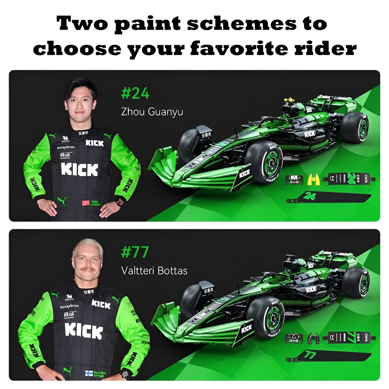 ["2024 Kick Sauber C44 F1 race car": Simulated independent suspension with four wheels, DRS rear wing, and aerodynamic body design... Exclusive, custom nameplate and car liveries No. 24 and No. 77 can be swapped as desired. More details on the C44 race car...