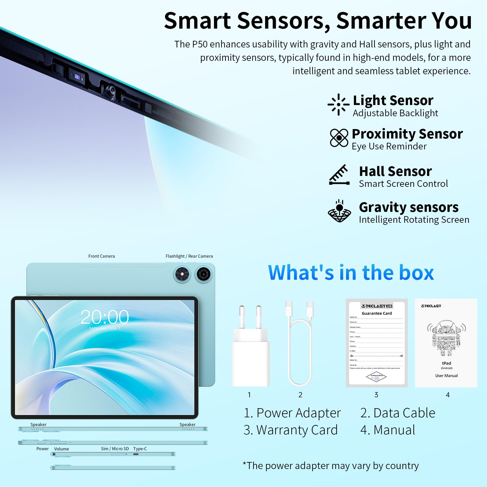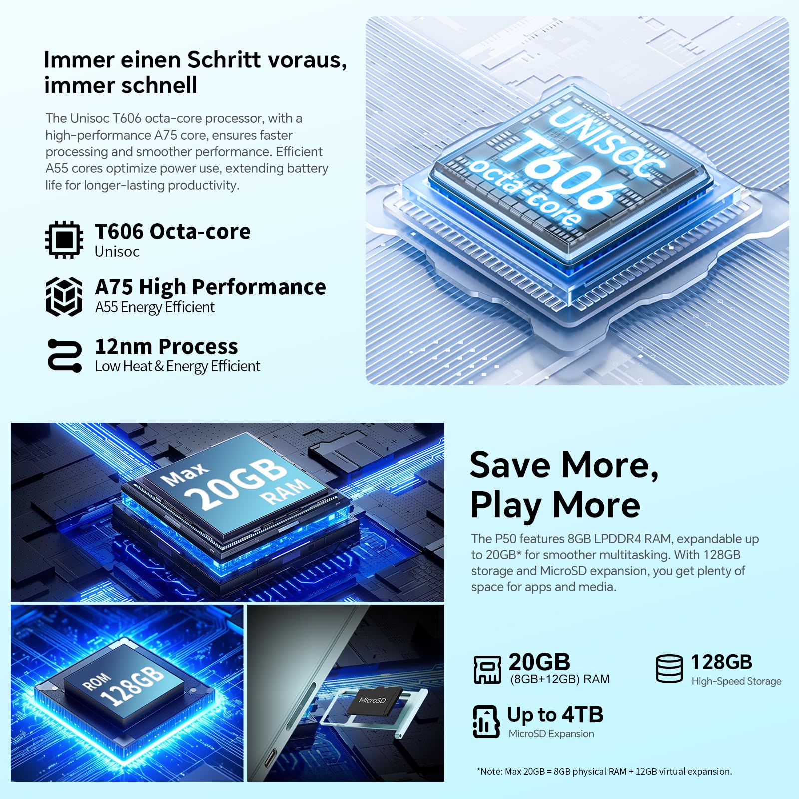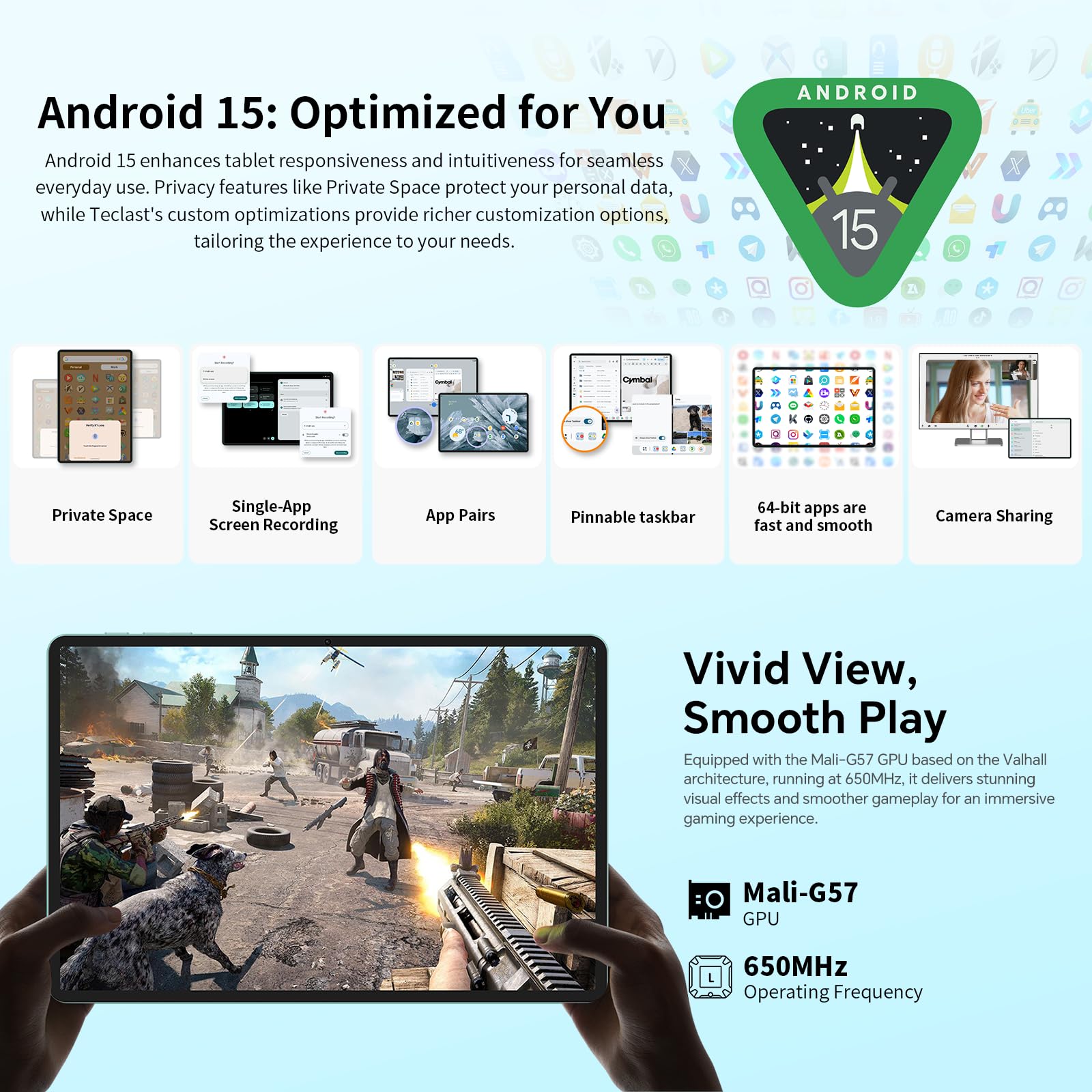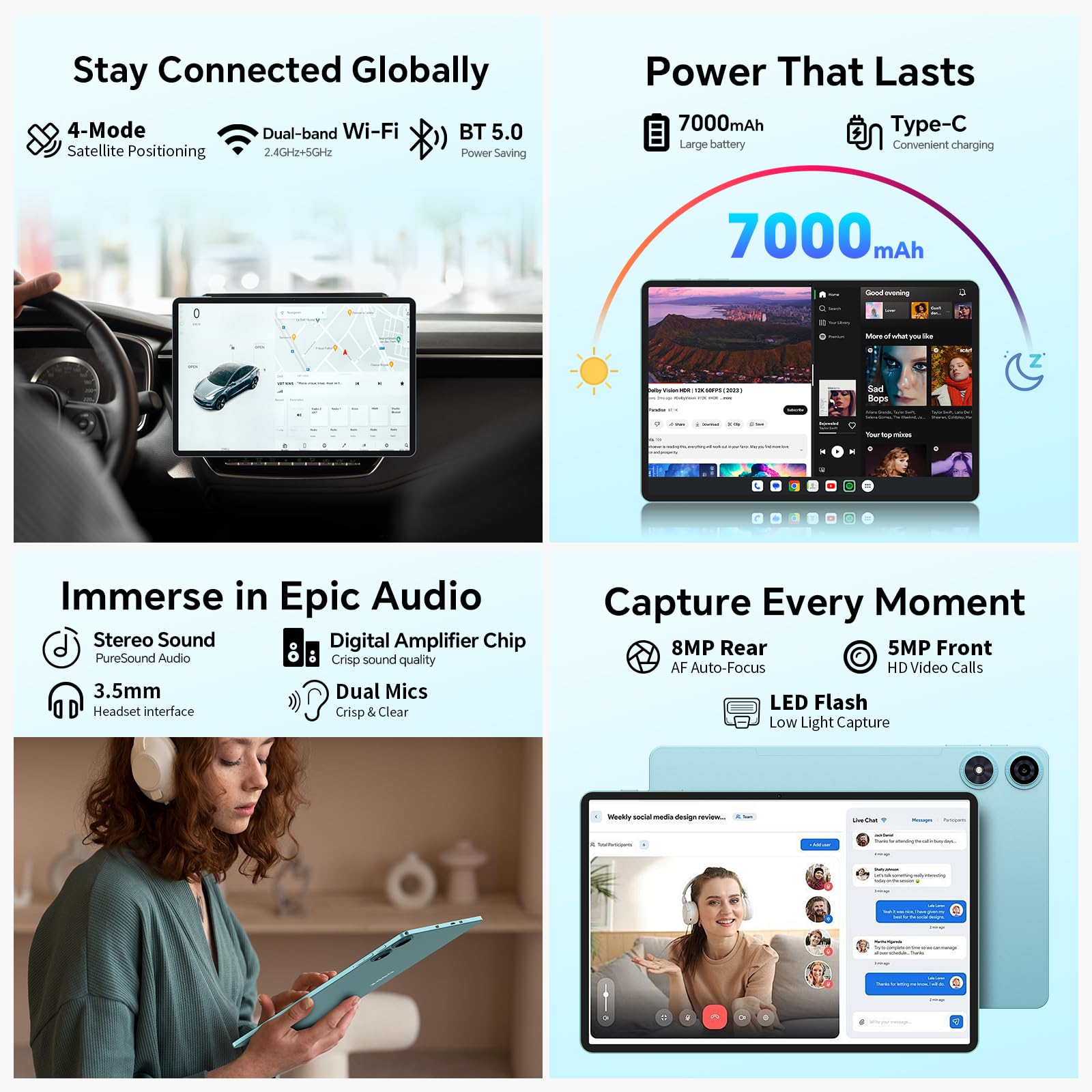 ["🏆【Android 15 Tablet + Octa-Core CPU + GMS】The TECLAST P50 Android 15 tablet features a highly customizable user interface, compatibility, and operational efficiency, allowing you to work and play intelligently. The powerful UNISOC Octa-Core processor T7200 provides easier access to everyday applications. It is also GMS certified, allowing you to easily download commonly used software from the store.","🚀【20GB RAM + 128GB ROM + 5TB Expansion】Teclast P50 comes with 20GB RAM (8GB LPDDR4 + 12GB expandable storage) and 128GB ROM. Micro SD allows storage expansion up to 5TB for exceptional multitasking. 128GB high-speed ROM storage for storing large games and audiovisual works. Listening to music and watching videos provides a more immersive experience. You can enjoy stable services and favorite apps.","📞【4G LTE SIM + 2.4G/5G WiFi + Parental Control】The TECLAST 11+ inch tablet supports two 4G LTE SIM cards and 2.4G/5G dual-band high-speed WiFi for internet connectivity anytime, anywhere. With a thickness of 8mm and a metal body, it is comfortable to hold, easy to carry, and perfect for work and study. The parental control mode is designed to help children balance learning and entertainment.","🔋【7000mAh Battery + 2 Speakers + GPS】This Android tablet LTE is equipped with a 7000mAh battery, offering 10 hours of video playback, 12 hours of music playback, and 11 hours of internet browsing, making it the perfect companion for work and leisure. Two stereo speakers provide clearer and louder sound. The four navigation modes GPS/BDS/GLONASS/GALILEO make it a great travel companion and a great tool for outdoor enthusiasts.","🎬【11 Inch Tablet 2K HD Screen, 8MP+5MP Camera】The tablet features an 11-inch HD screen (1200 x 800 resolution) for a crisp viewing experience. The TDDI technology integrates the touch sensor into the IPS screen structure, making the tablet thinner, lighter, and more touch-sensitive. The tablet has an 8MP Sony camera on the back to capture the moment, and a 5MP front camera for sharp selfies and video calls."]
