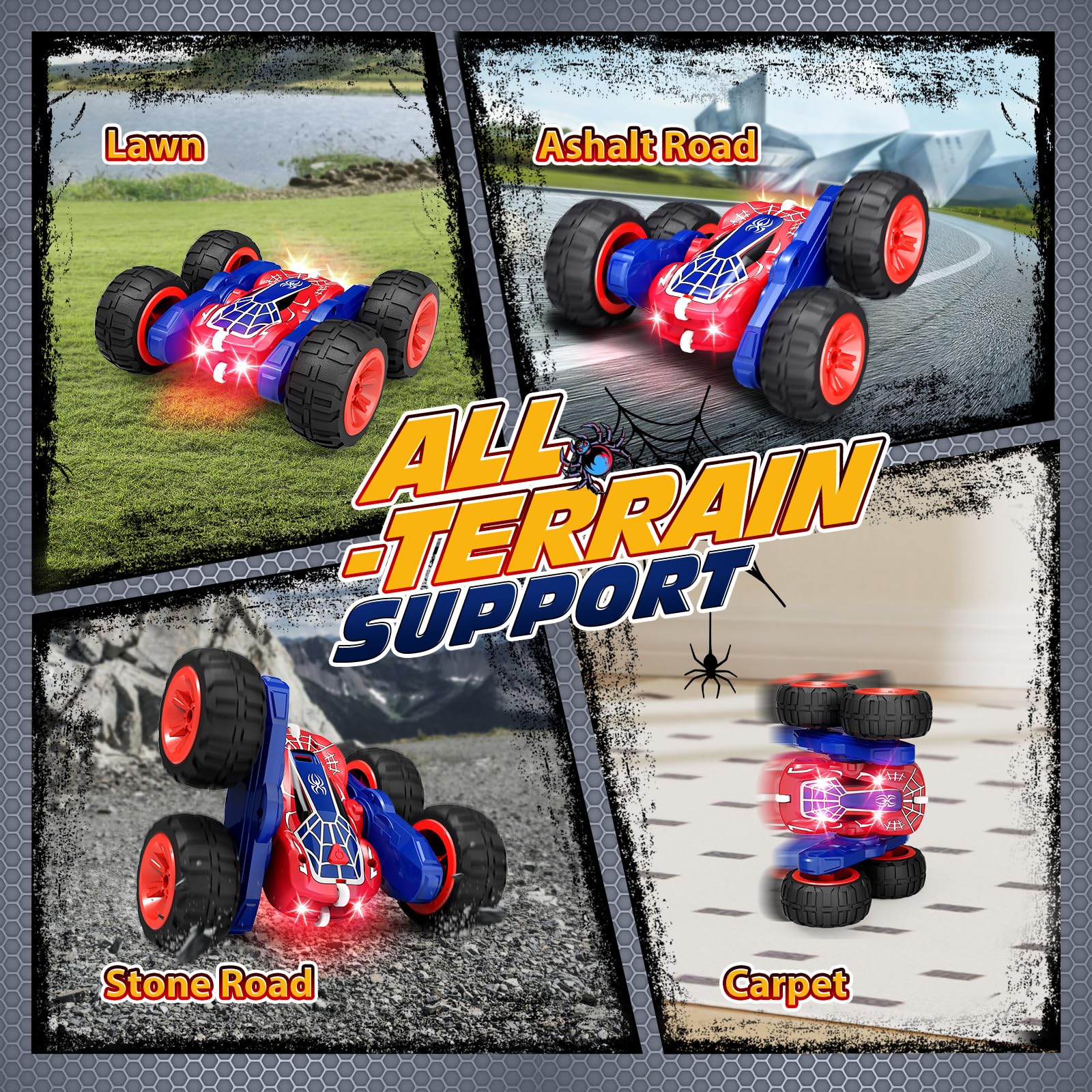 ["【360° Cool Stunts】360 degree flip, cool upgraded new look, double-sided driving, forward, backward, left turn, right turn, flexible control provides a great gaming experience. Doubly upgraded body and performance, bigger and cooler, brings endless fun for kids!", "【Multiple RC Cars Playing at the Same Time】The 2.4Ghz frequency system ensures a smooth and uninterrupted racing experience, allowing multiple cars to compete side by side, each with its own responsive controls. Kids can experience the joy of playing with friends.", "【Sturdy and Durable】The remote control car is made of high-quality ABS material, sturdy and durable. The tires are made of high-quality elastic rubber, shock-absorbing, non-slip, and can withstand a variety of terrains like beaches, wetlands, grasslands, and more, making it the top choice of outdoor toys for boys aged 3-12.", "【Type C Charging and Long Battery Life】One of the advantages of the Type C charging function is that you do not need to remove the battery from the remote control car. Simply plug the Type C charger into the charging port of the remote control car and the battery will charge. This is very convenient for kids. The 500 mAh battery offers a operating time of over 25 minutes, depending on your usage and driving conditions.", "【Every Kid Wants It!】Remote control cars can help cultivate children's intelligence and train their practical and mental skills. Perfect for boys, girls aged 3-12+. The stylish appearance of the RC car makes it the perfect children's gift for birthdays, holidays, Christmas, or any special occasion."]
