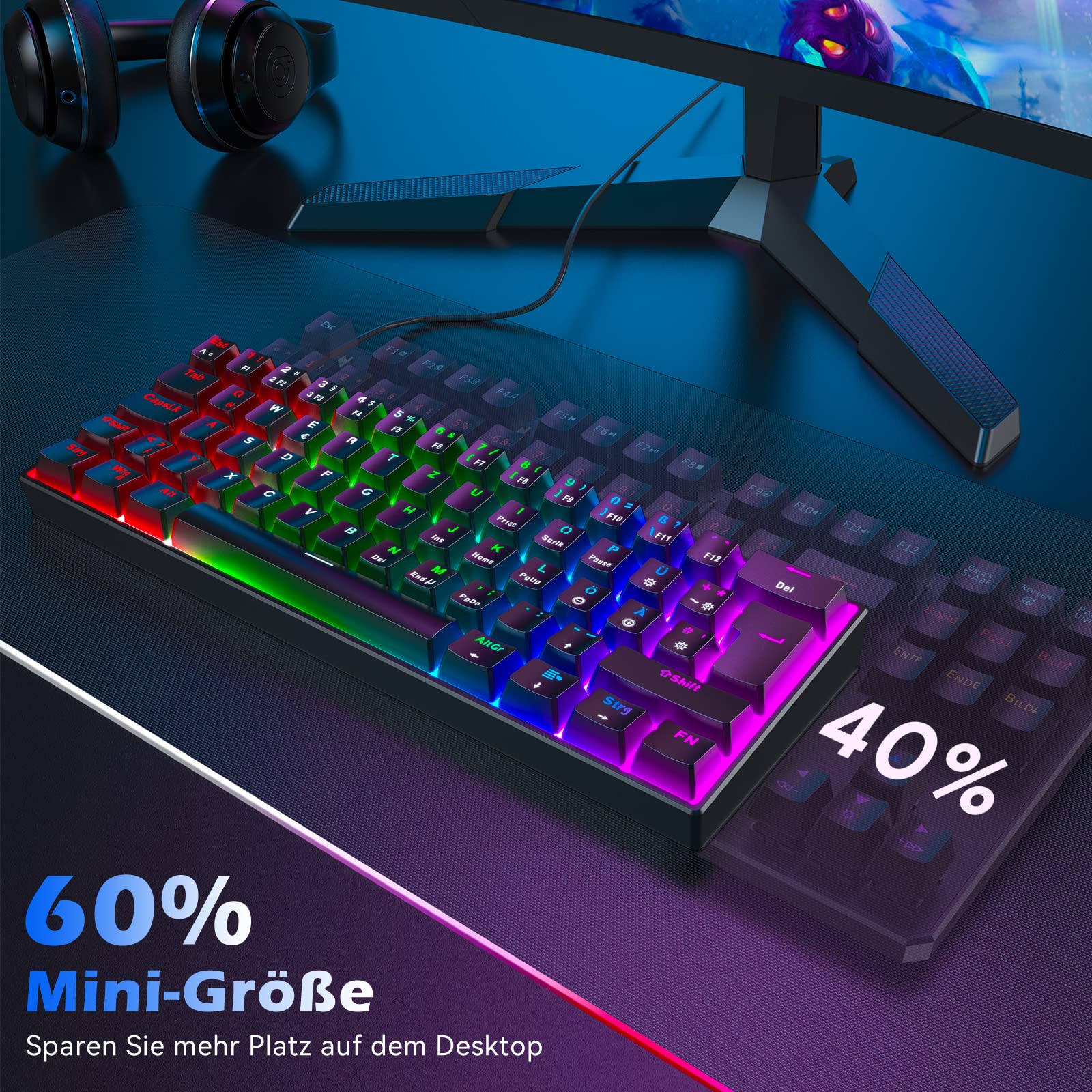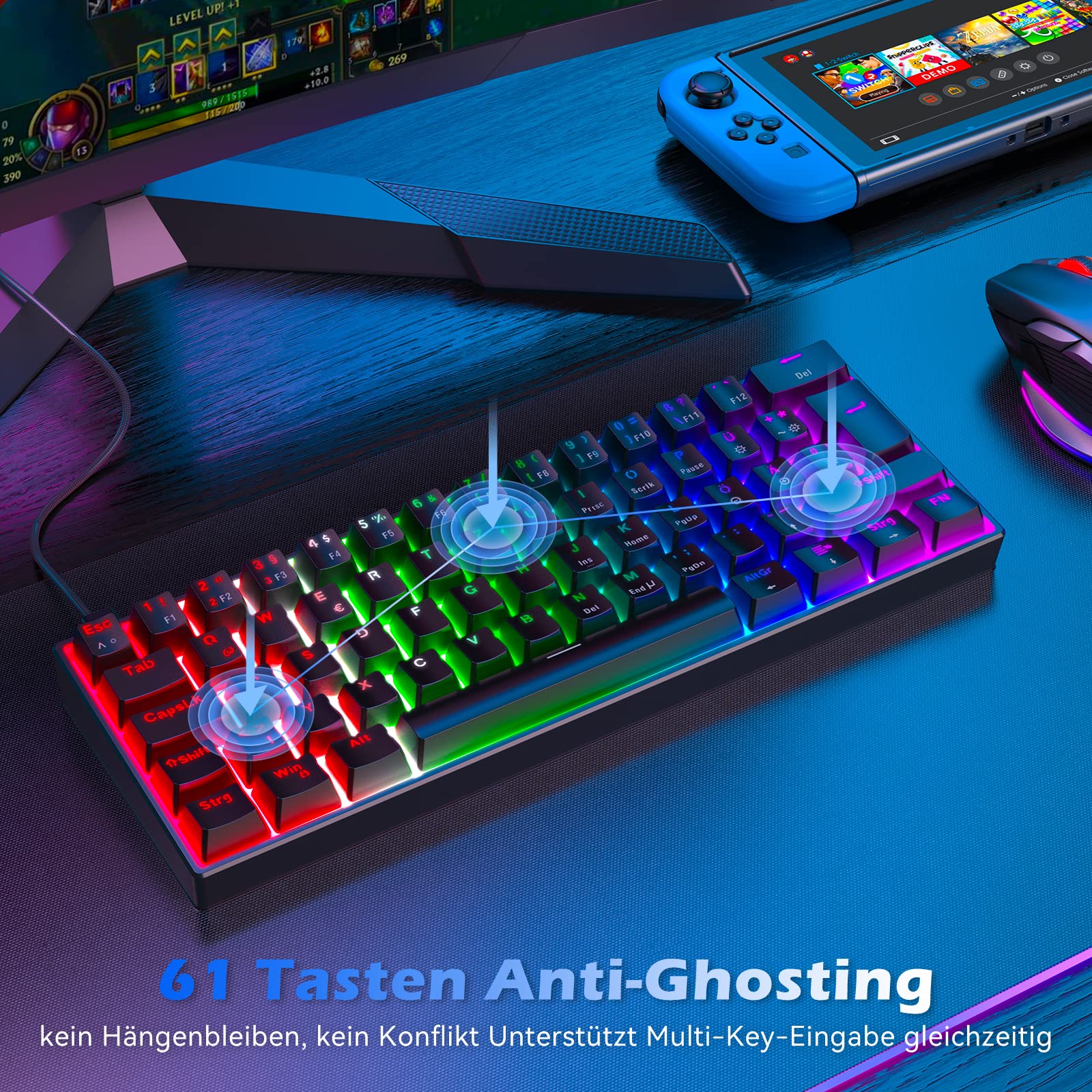 TECURS Mechanical Gaming Keyboard, Mechanical Keyboard 60 Percent QWERTZ Red Switches for PC Gamers and Work, 61 Keys Wired Keyboard for PC Windows/PS5/PS4, Black