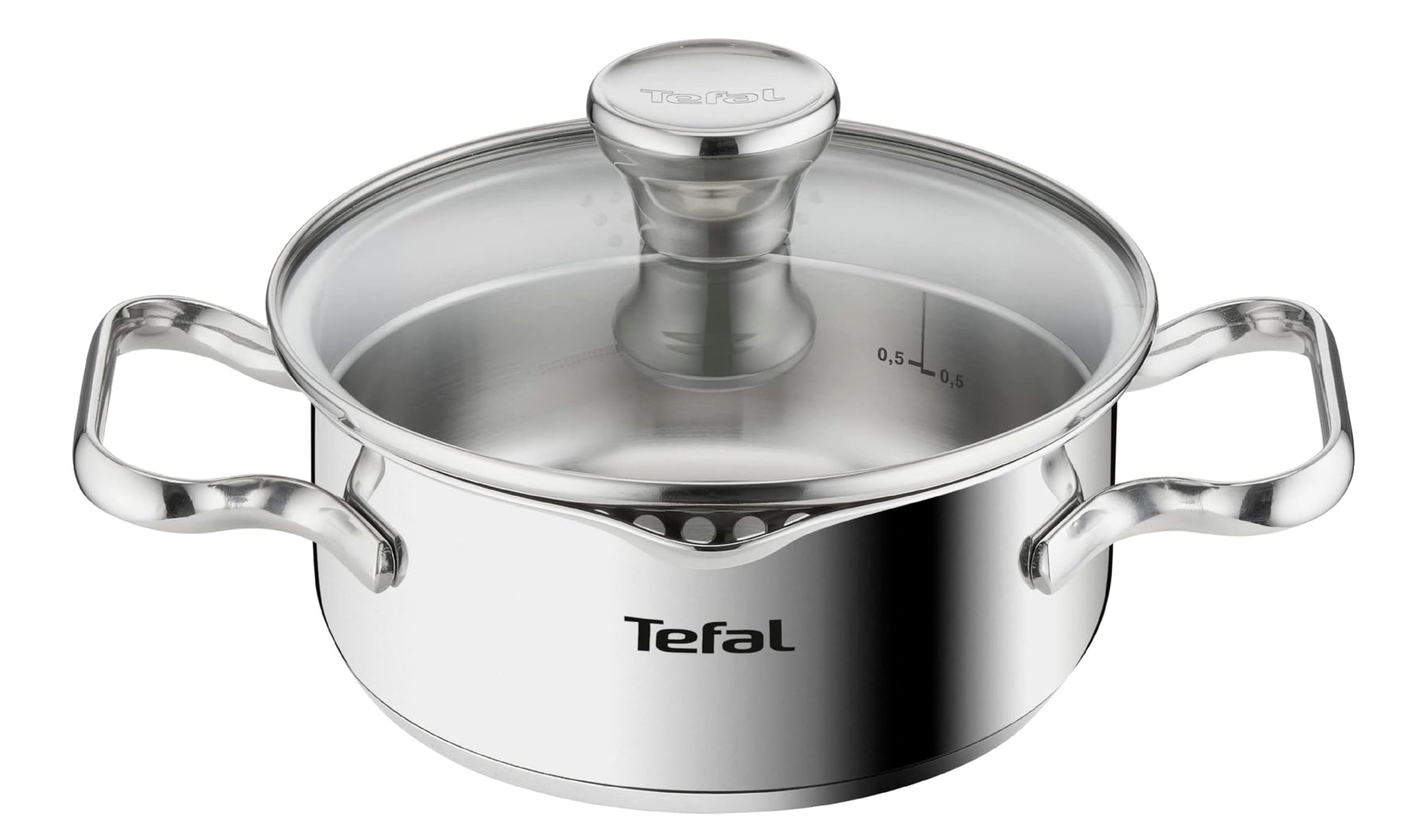 Tefal Duetto pot A70542 | 16 cm | Induction compatible | Easy to clean | Measuring scale | Glass lid for pouring off | Stainless steel