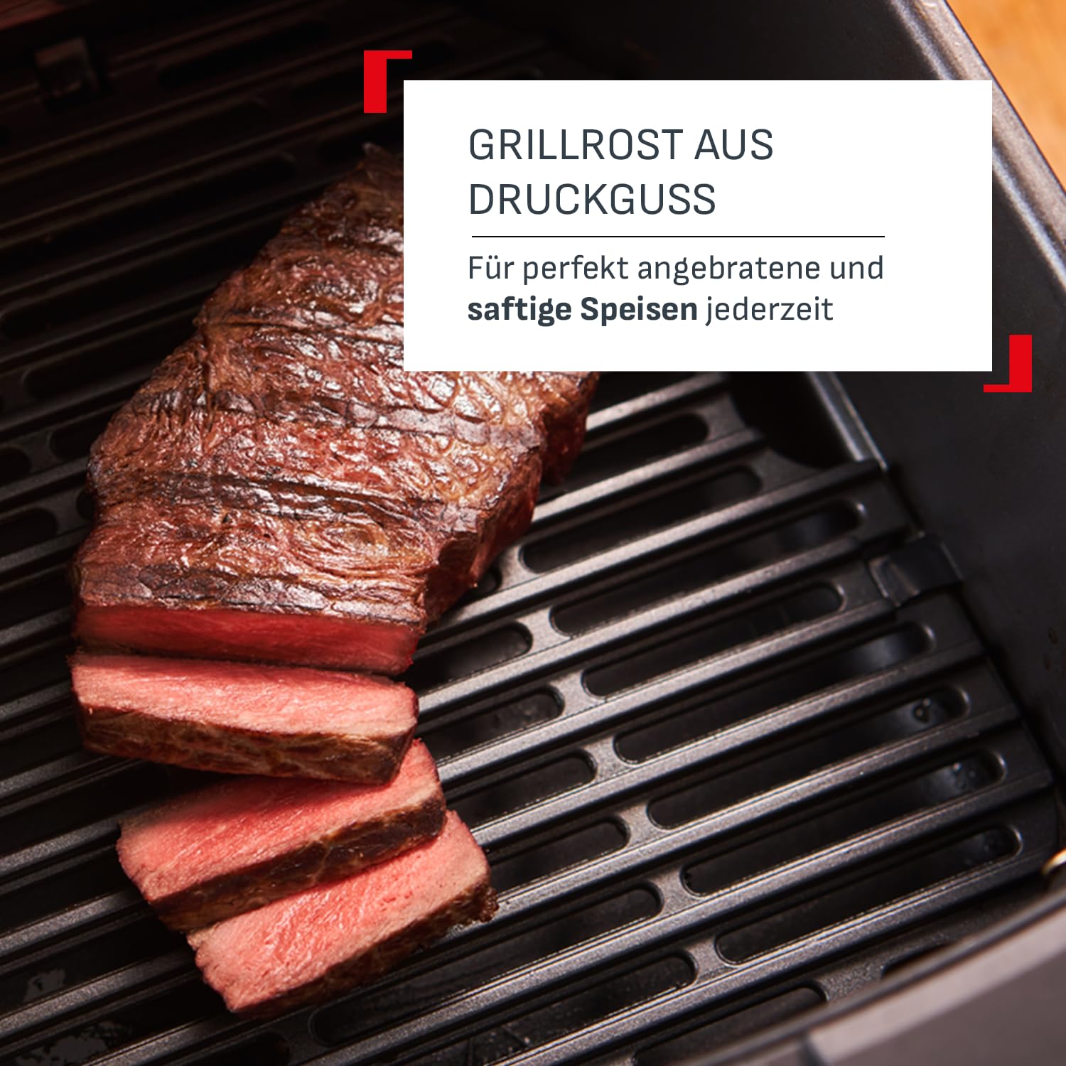 "Grill technology: A die-cast aluminum grill plate for tender, juicy meat or vegetable dishes perfectly grilled with extra grill marks; convenient: 60-minute timer and automatic alarm function",