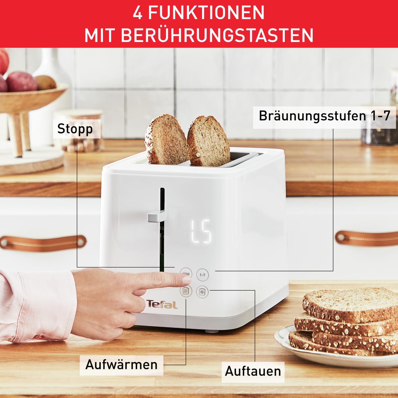 ["Integrated digital display: White toaster with a minimalist, easy-to-read digital countdown display for precise and controlled browning", "4 function buttons: 7 browning levels, functions for stop, defrost, and reheat", "Variable slot width: For automatic bread slice centering, equally ideal for thin and thick slices", "Lift system for easy removal of toast slices, even the smallest ones; removable crumb trays: Quick and easy cleaning", "Included in delivery: Tefal TT6931 Sense Toaster"]