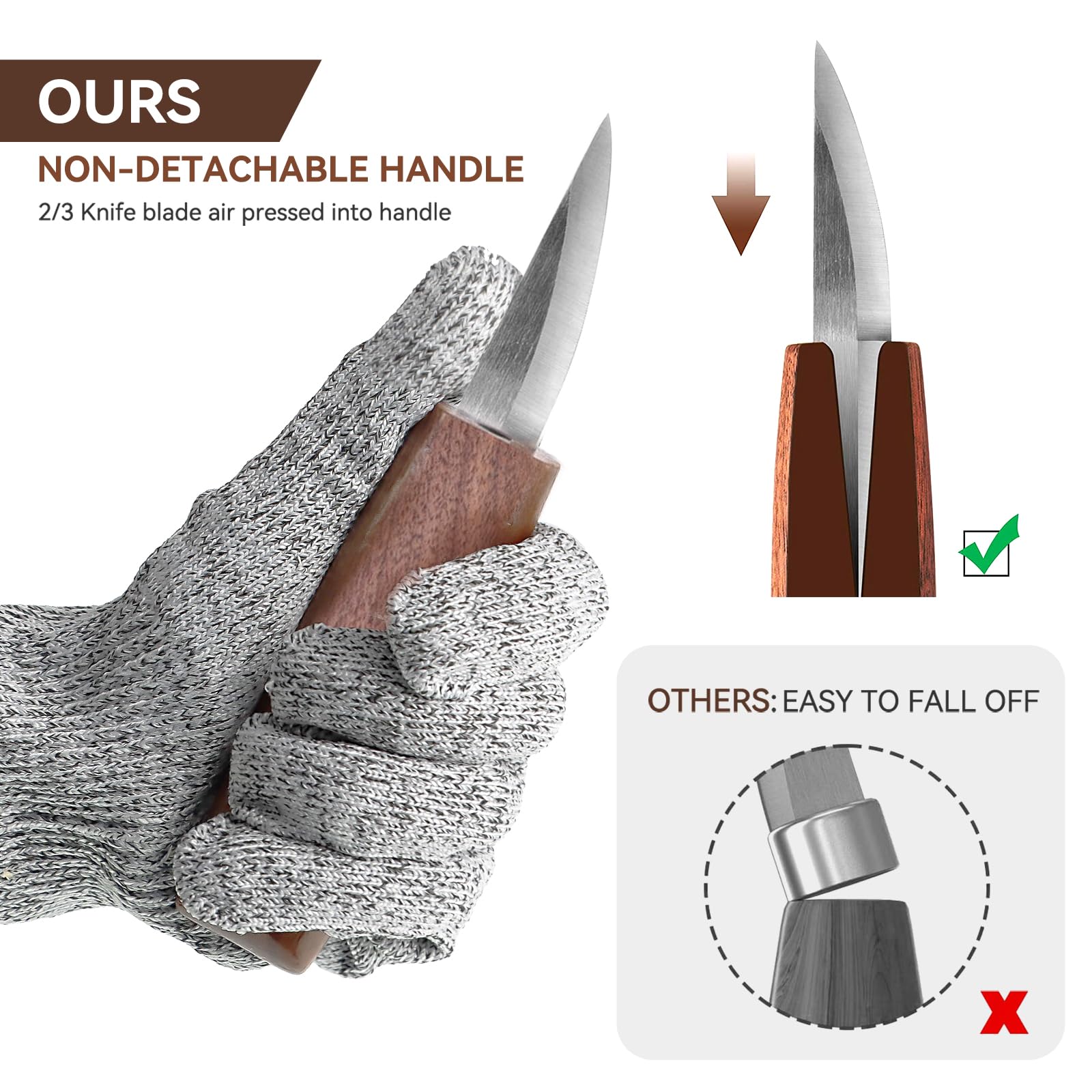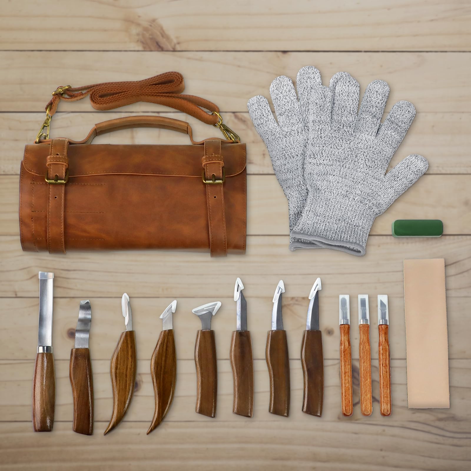 ["1. Carving Knife Set Enormous Deluxe Edition: This carving set includes 15 carving tools. 8 carving knives, 3 detailed carving knives, a pair of cut-resistant gloves, a polishing paste, a leather strap for storing the instruments. A great carving set for professionals and wood carving enthusiasts who can easily carve a variety of wood carvings","2. Carving Tool Premium Quality: The handle of the carving knife is made of walnut wood and has a rounded design that is ergonomic and comfortable to hold. They also look stylish. The carving tool of wood carving knife has a long leather case for safety and comfort","3. Durable Carving Knife for Adults: The blade is made of sharp hard carbon steel blade, high strength and hardness, it has excellent edge performance, razor-sharpness, and exceptional corrosion resistance, it can keep knife edge sharp and not curl after multiple wood carvings, easy to carve","4. Carving Tool Tools Leather Organizer: All carving knives and carving tools for wood come in a convenient leather case so you can carry them around with joy and ease","5. The carving set is a great gift: Our carving knife would be a great gift for a carving colleague or someone who is just starting on this path of creativity and craftsmanship! And can be used as Christmas, birthday, and Thanksgiving gifts for family, friends, and lovers to experience the fun of the wood carving tool set together"]