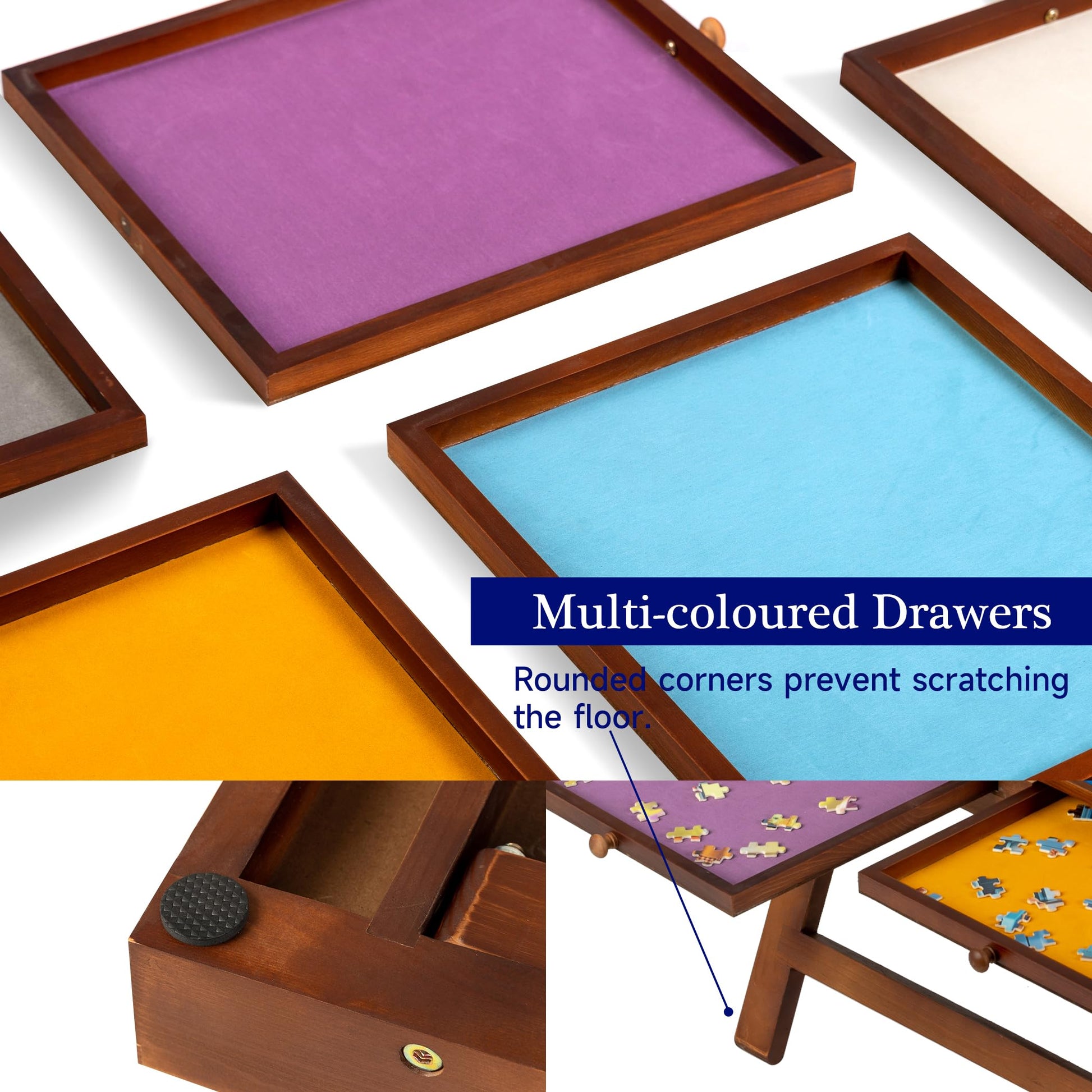Equipped with 6 Colored Drawers - 6 drawers covered with different colored felt, allowing you to sort the puzzle pieces by color, shape, or pattern, helping you complete the puzzle quickly and improve your game efficiency. Each drawer is equipped with a magnet to ensure that all drawers remain closed during transport.