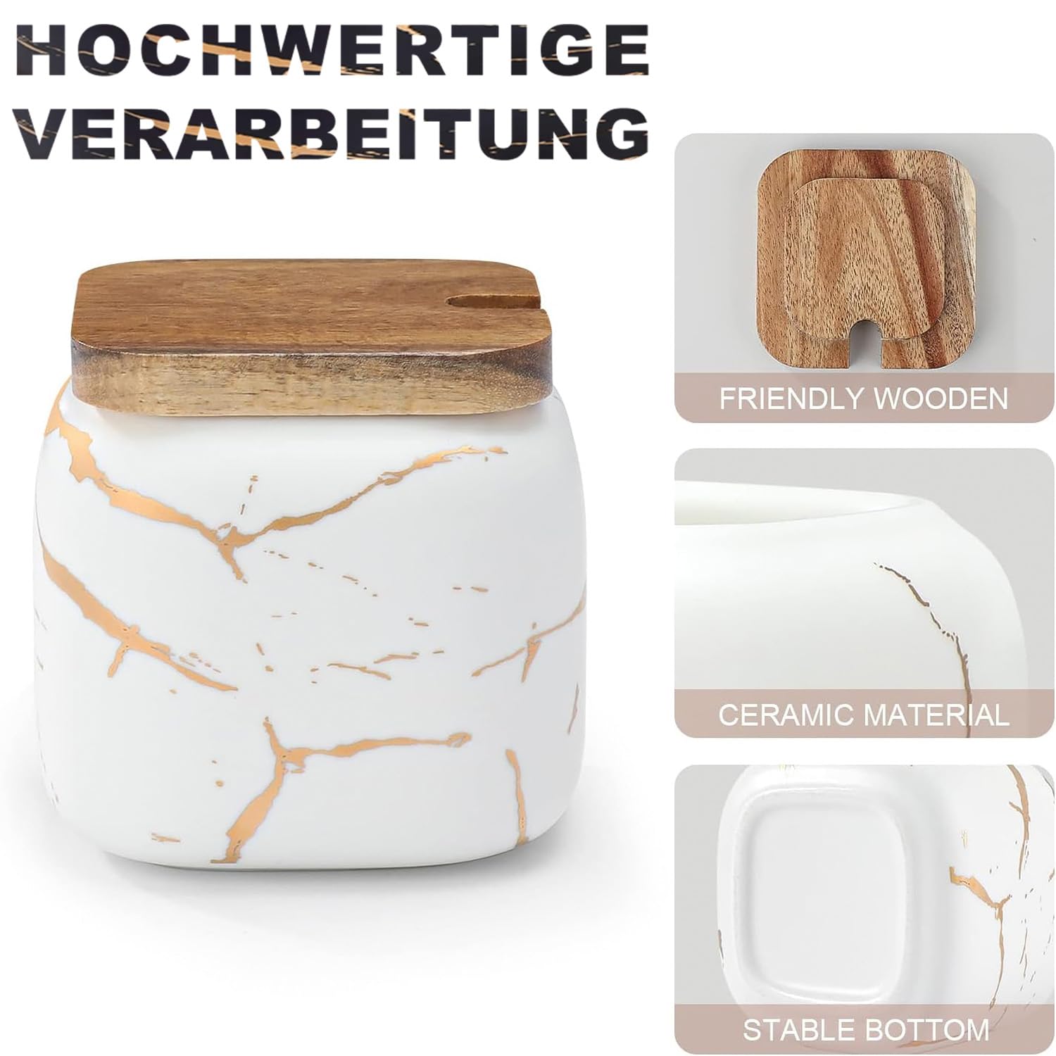 ["đăEye-Catching Decoră - The stylish marble pattern, matte ceramic surface, and elegant acacia wood make the TELANKS sugar bowl a fashionable highlight for your kitchen and coffee table.","đăSpecificationsă - The set includes 3 ceramic sugar bowls, 3 wooden lids, 1 wooden tray, and 3 wooden spoons. The size of the spice jars with spoon is 3.5 x 3.5 x 3.4 inches, with a total capacity of 38 oz for all three. The wooden tray size is 11.4 x 4.1 inches, and the wooden spoons are 5.1 inches long.","đăSuitable For Various Occasionsă - The sugar bowl with spoon and lid can be used to serve sugar with a cup of coffee with friends. It also works as a salt cellar or spice jars with spoon while cooking and can serve as a sauce dish on the dining table.","đăEasy Cleaningă - The ceramic components of the spice jars are dishwasher safe and do not absorb odors. The wooden components can be cleaned with water; simply let them dry, and they will bring you joy for a long time.","đăService Guaranteeă - We carefully package each spice jars with spoon, but there is a slight chance that the ceramic may be damaged during transport. If you receive broken ceramic or are not completely satisfied with our product, please contact us. We will address your concerns within twelve hours."]