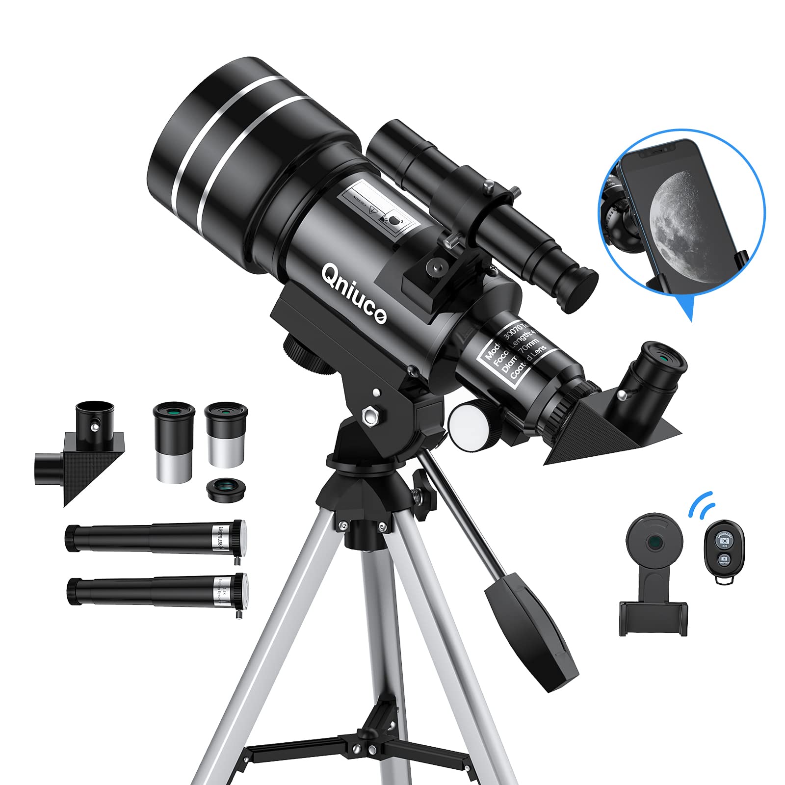 ["【Telescope Astronomy】-- 300 mm focal length and 70 mm aperture. Fully coated optics and multi-coated lens provide almost lossless transmission for sharp images with increased brightness and clarity.","【Optimal high magnification】-- Our telescope comes with three eyepieces (6 mm, 20 mm) and can be magnified from 30x to 150x. The 5x24 finder scope makes locating objects easier.","【Suitable for day and night】-- The telescope can be used for day time: bird watching, viewing; For night time: observing the moon and stars. Great gift idea, not only for children but also for astronomy beginners. Telescope with phone adapter makes it easy and quick to take photos of the objects being observed.","【Great gift idea】-- The telescope is a perfect Christmas or birthday gift for children or astronomers. It helps them to build an interest in astronomy and science, explore the unknown, enjoy nature, and have fun away from the screen. Children's astronomical journey begins here.","【Customer service】-- Easy installation, no tools required. If you have any questions about the telescope astronomy, feel free to contact us, Reliable and friendly customer service available 24 hours."]
