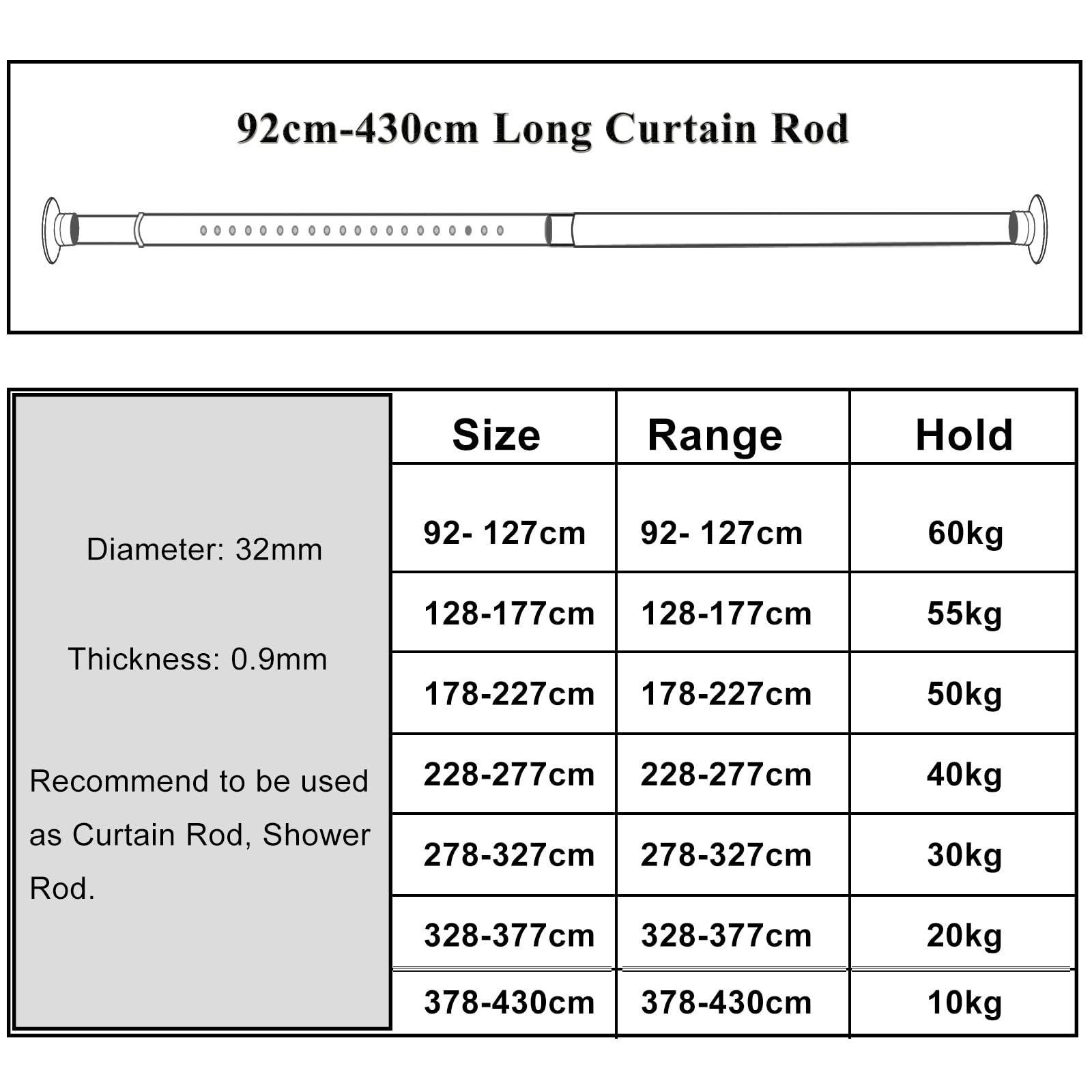 ["①Adjustable tension rod ranging from 328cm to 377cm. This extendable long curtain rod is the best choice for bathroom curtains, large windows, kitchens, closets, and other temporary spaces. Packing list: 1 x spring rod, 2 x long extension rods, 2 x end caps","②Durable: This curtain rod is made of stainless steel with a 32 mm diameter and 0.9 mm thickness, strong and durable, waterproof and moisture resistant.","③Easy to install: No drill required, the adjustable curtain rod does not need tools and can be installed in minutes.","④Safe to use: This extendable curtain rod does not require drilling and will not damage your walls.","⑤ Strong load-bearing capacity: This curtain rod can hold up to 20 kg. It is recommended for use as a large curtain rod."]