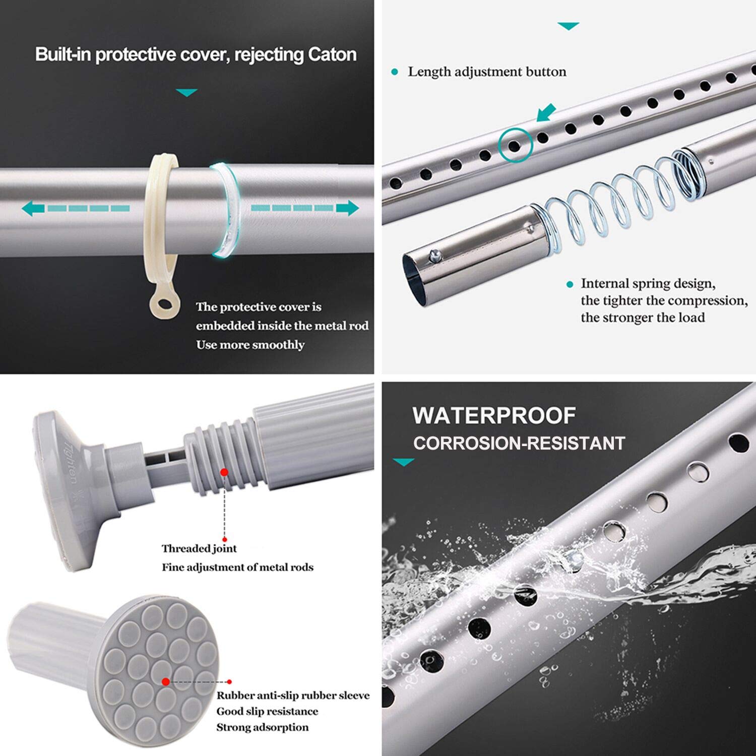 ["① Adjustable tension rod from 129 inches to 148 inches. This extendable long curtain rod is the best choice for bathroom curtains, large windows, kitchen, cabinets, and other temporary spaces. Packing list: 1 x spring rod, 2 x long extension rod, 2 x end caps","② Durable: This curtain rod is made of stainless steel with a diameter of 1.25 inches and a thickness of 0.035 inches, strong and durable, waterproof and moisture resistant.","③ Easy to install: No drill required, the adjustable curtain rod does not need tools and can be installed in minutes.","④ Safe to use: This telescopic curtain rod does not require drilling and will not damage your walls.","⑤ Strong bearing capacity: This curtain rod can hold up to 44 lbs. It is recommended to use it as a large curtain rod."]