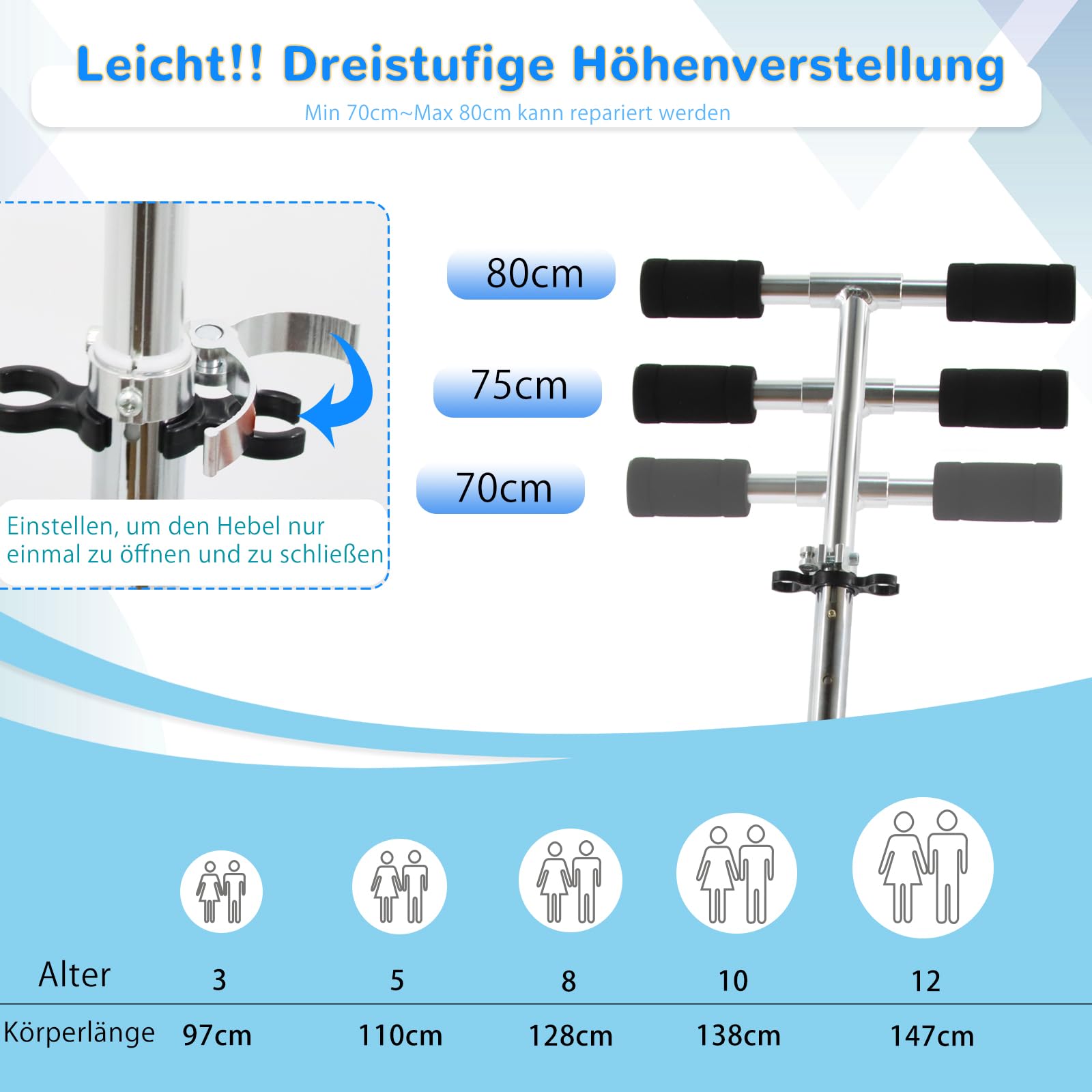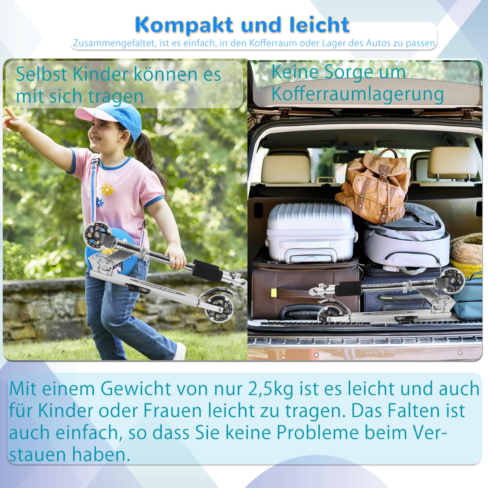 "Safe and reliable: The kids scooter made of aluminum with ABEC 7 bearings and springless shock absorption system offers much safer and quieter riding on uneven pavements or bumpy roads. Adjustable height: The handle height can be adjusted (27.6 - 31.5 inches) to accommodate children from 3 to 5.2 feet tall. The 2 wheel scooters are designed for kids aged 3 to 10 years. LED flashing wheels: The LED lights on the children's scooter wheels require no batteries and only work through the rolling wheels. This means that the wheels light up in different colors as the child rides the scooter. Let your boys/girls have fun at night. Efficient folding function: No tools needed, easy and safe to fold and unfold in seconds, easy to use, easy to carry. Maximum fun: The Ten Boom Kids Scooter is designed to provide children with maximum fun while prioritizing safety."