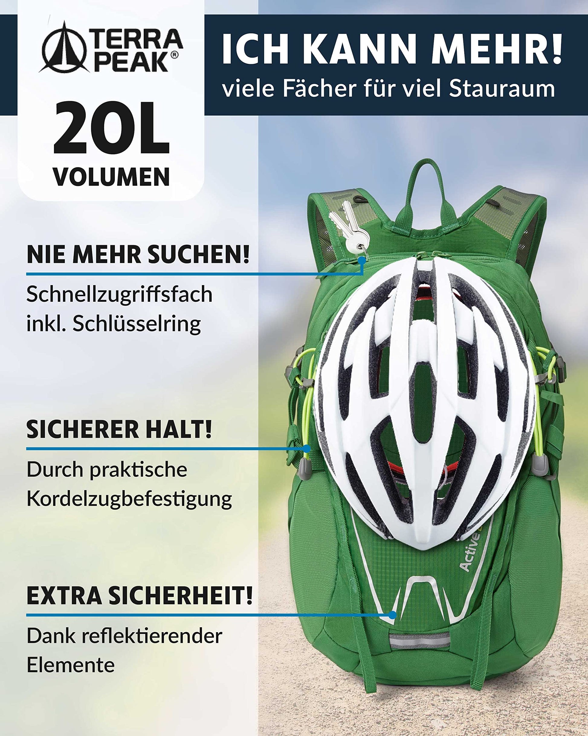 ["✅ PREMIUM QUALITÄT: The green backpack is made of 420D Terra Pro Ripstop Nylon and 600D Polyester, equipped with YKK zippers. With a volume of 20 liters, dimensions of 45x27x14 cm and weighing only 725 g, it is a perfect daypack and all-rounder.","✅ RÜCKENSYSTEM: The Air Vent Contact back system with 3D AirMesh padding ensures a perfect fit. The anatomically arranged back pads guarantee optimal back ventilation. High wearing comfort thanks to individually adjustable, anatomically shaped, ventilated shoulder straps with a height-adjustable, elastic chest strap and a hip belt.","✅ BESONDERE FEATURES: Versatile (multisport) backpack for excursions, hikes, and bike tours. It offers a large main compartment with an A4 insert pocket for a laptop or tablet, making it suitable for school, university, work. Water bottles, hiking poles, sleeping mats, or jackets can be attached. In rain, the backpack is protected by water-repellent material and a rain cover.","✅ GROßER STAURAUM: The backpack is equipped with 4 compartments. A spacious main compartment with a wide-opening zipper and an extra-large opening for easy loading and hydration system preparation. Two front compartments for small items and a padded compartment for valuables. Our backpack is universally usable as a hiking backpack, trekking backpack, day pack, touring backpack, backpack, ski backpack, and bike backpack.","❤️ START-UP FEELING: Designed and Developed in Germany. Since 2018, as a young company, we have been pursuing the mission to offer you perfect products of excellent quality for your next outdoor adventure, so you can enjoy all your trips with lots of FUN and JOY."]