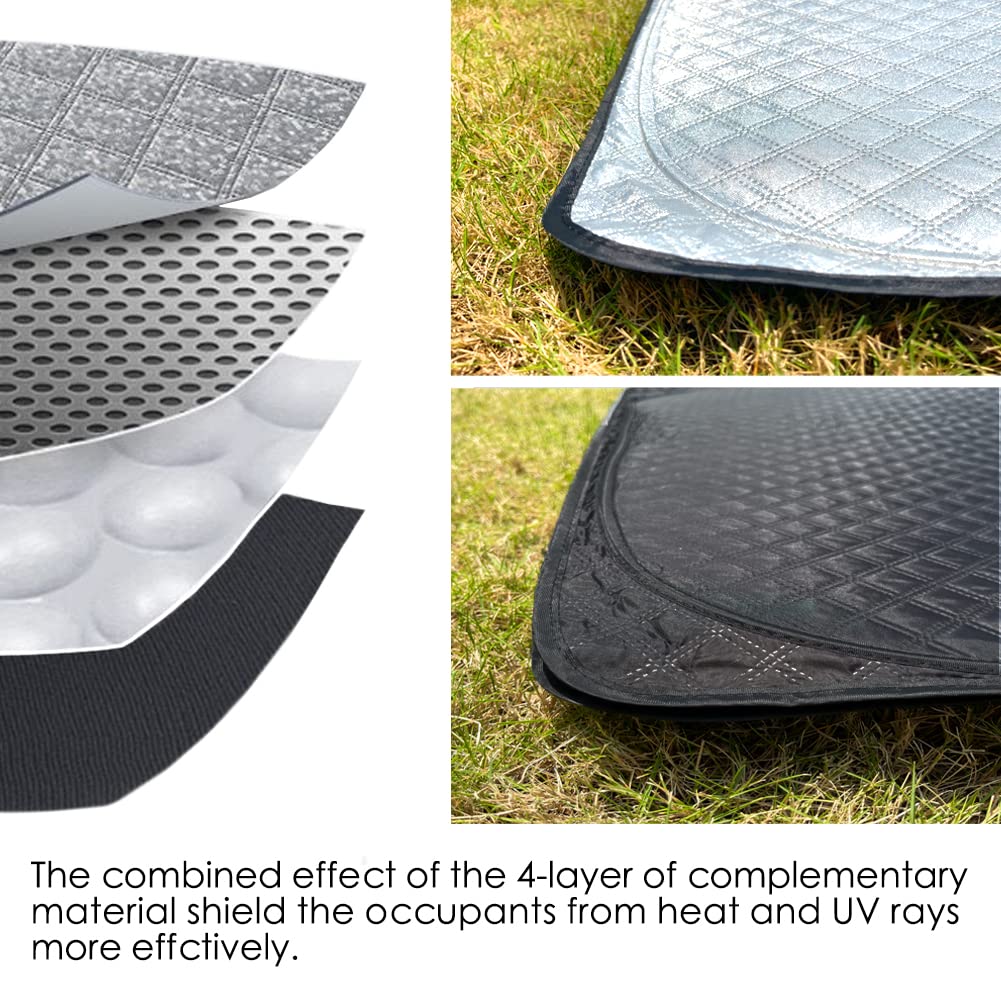 "DIVERSE MATERIAL - While there are many privacy curtains and sunshades on the market, few have the thermal properties of this product. The combined effect of the four layers of complementary materials protects occupants from heat and UV rays of the sun.