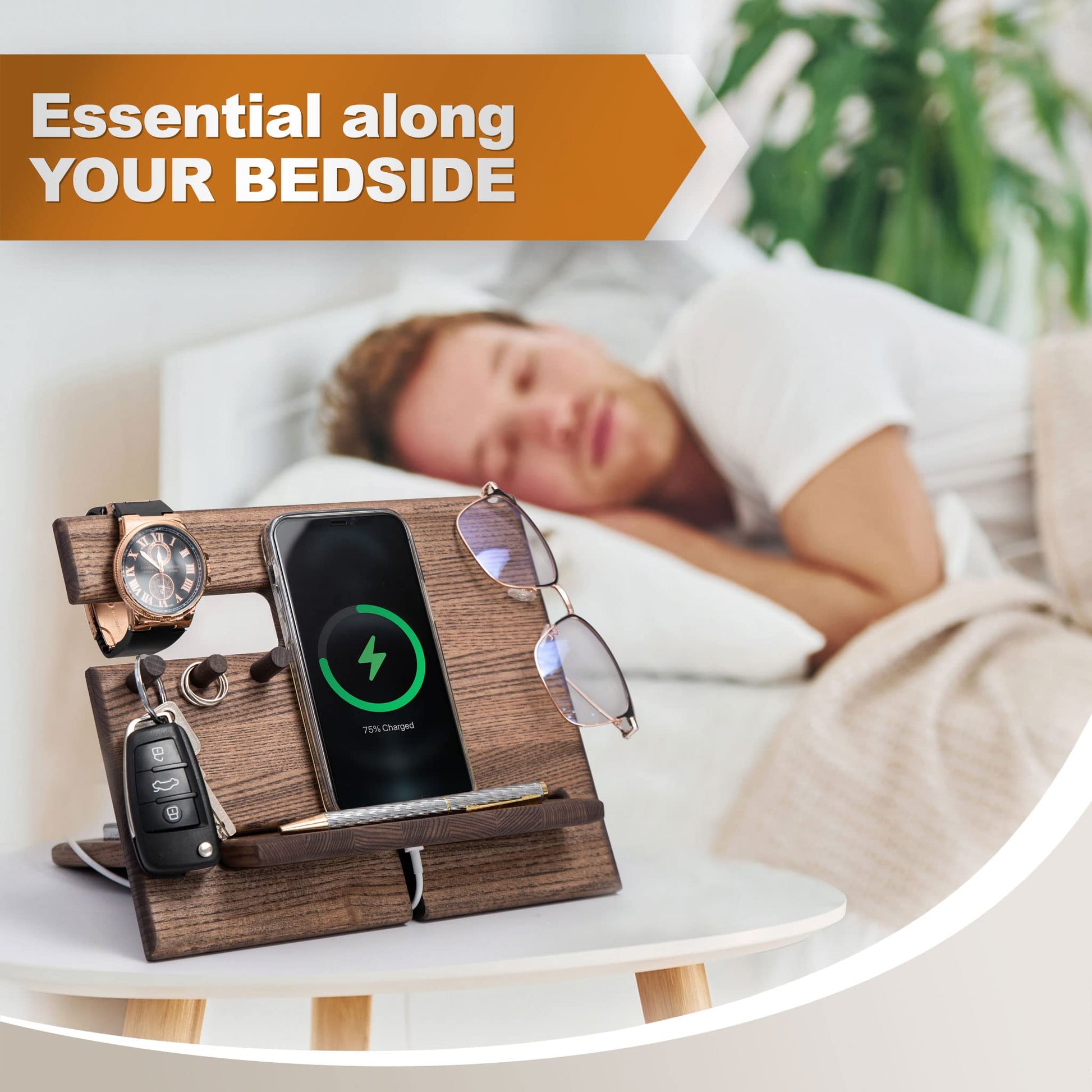 "COMPACT: The gift organizer has a light weight and a very compact size of 23.5 x 22 x 19.5 cm. Our nightstand organizer for men fits all types of smartphones"
