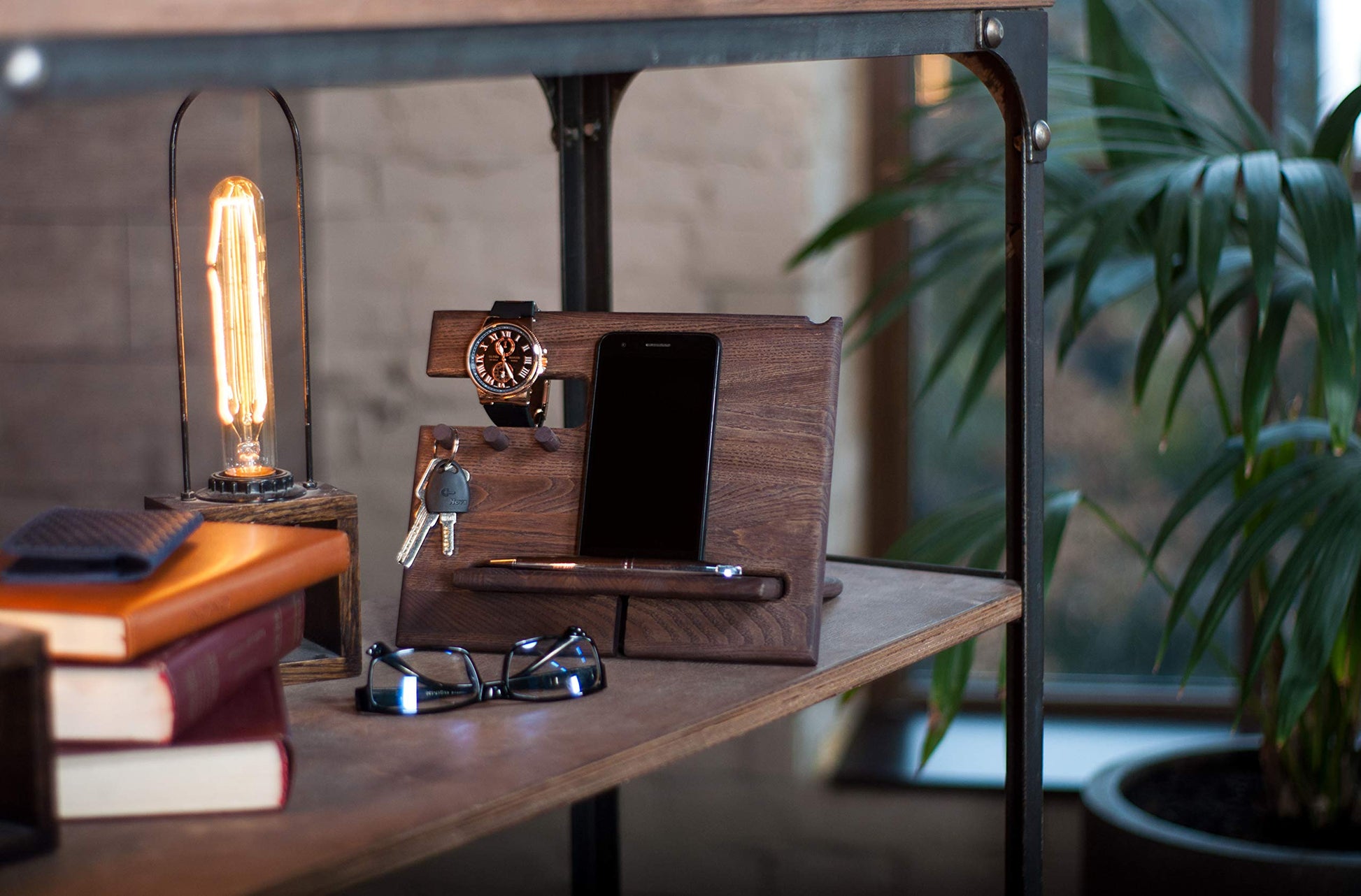 TESLYAR Desk Organizer Wood Ash Wenge - Phone Stand & Key Organizer with 3 Hooks for Office Storage & Organization - Wooden Gifts for Men Ideas