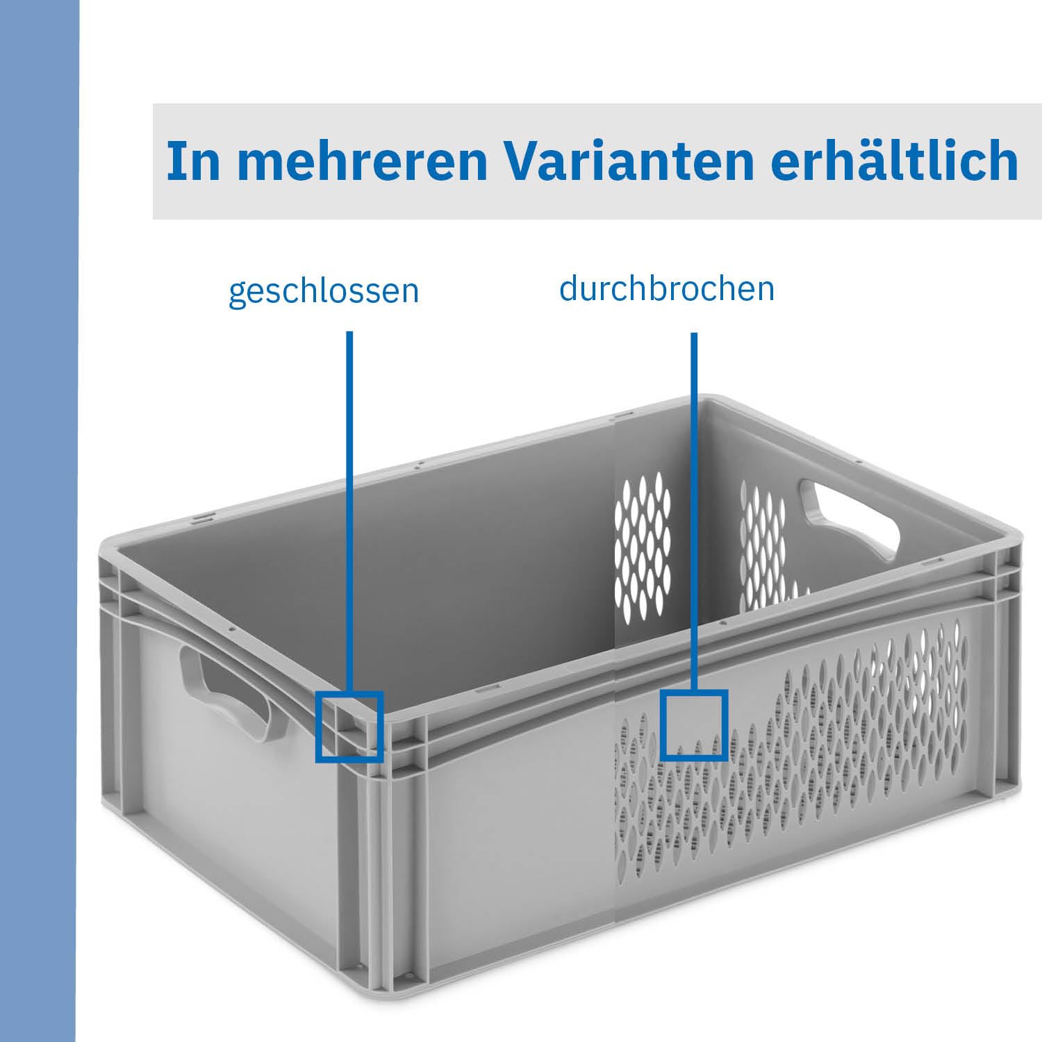 "The Euro standard containers in the basic size of 600 x 400mm impress with their unique, modern design and excel in stability, robustness, and quality. Whether in a closed or perforated version - the easy-to-clean containers are versatile as they are efficiently stackable and combinable.",