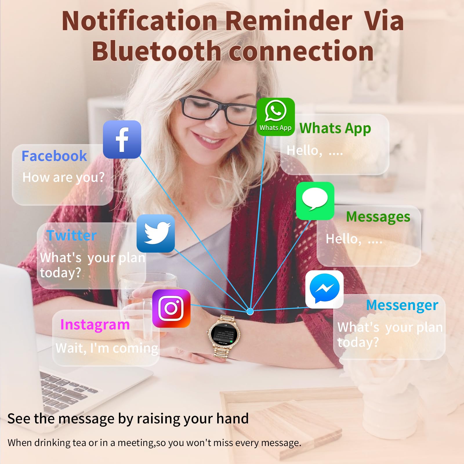 The Fitonyo smartwatch for women with phone function and diamond design features a 1.32" round HD display, call capability, and 120+ sports modes. Compatible with Android and iOS devices.