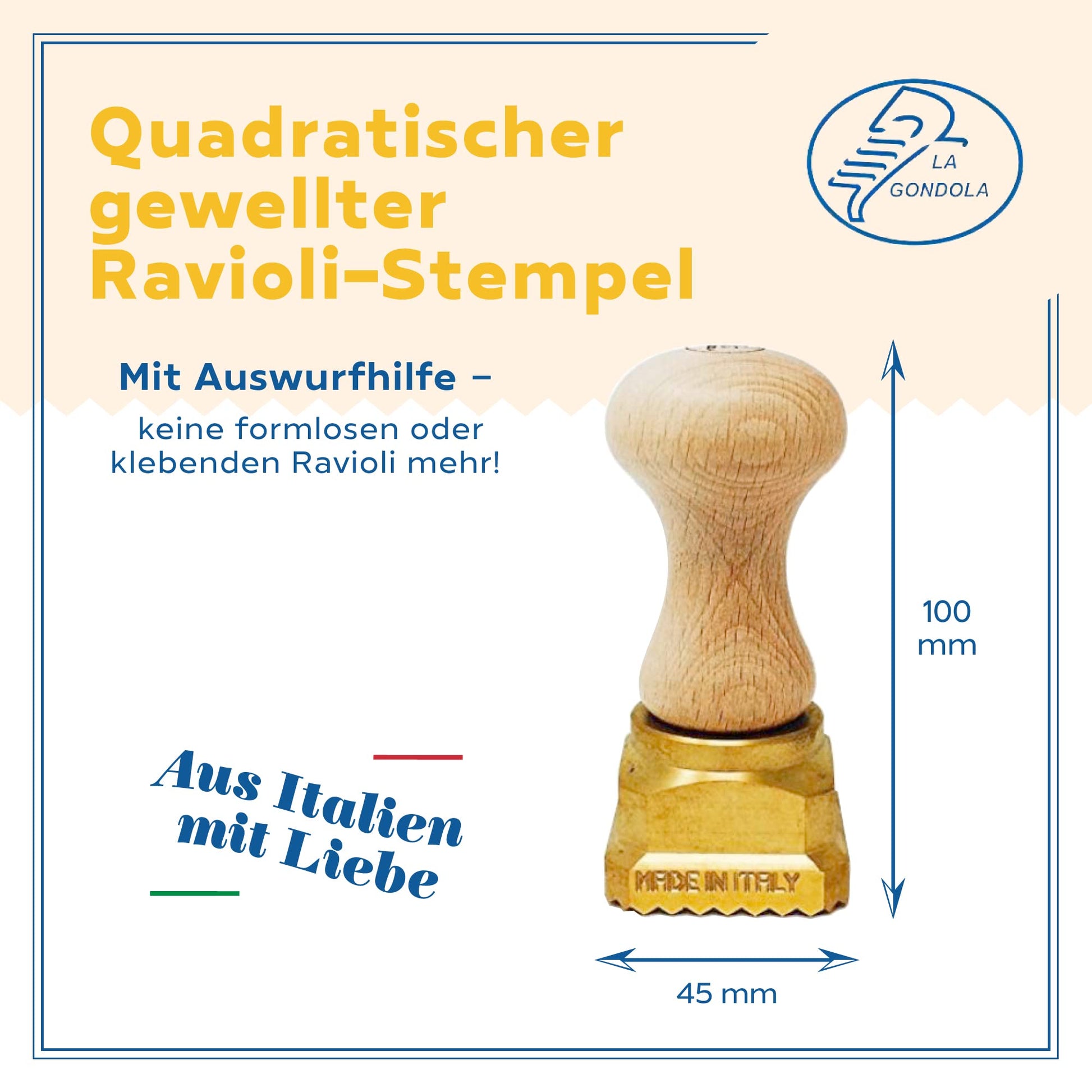 The Gondola Ravioli Stamp - Square Crimped 45x45mm | Italian Pasta Tool for Home & Commercial Kitchen | Brass, Natural Wood | Easy to Use | Ravioli Cutter Made in Italy