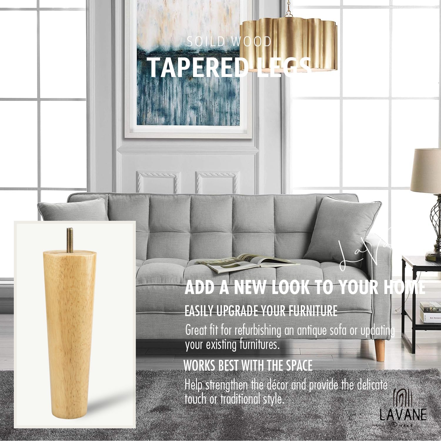 ["4 PIECES SOLID WOOD FURNITURE LEGS - Set of 4 sturdy furniture legs made of solid rubber wood (Height: 7.87 inches, Ø top: 2.28 inches, Ø bottom: 1.50 inches); supports up to 176 lbs per leg.","EASY ASSEMBLY - Thanks to pre-drilled M8 threaded bolts & including mounting plates + screws - Complete set for sofa, bed, cabinet or couch.","VERSATILE USAGE - Ideal as replacement for sofa, bed, cabinet, couch, ottoman or tables; gives furniture a new look.","STURDY CONSTRUCTION - Tapered shape for optimal stability; thick wood design resists weight and prevents wobbling.","HIGH QUALITY WORKMANSHIP - Sanded and painted surface; non-slip rubber pads protect floor surfaces."]