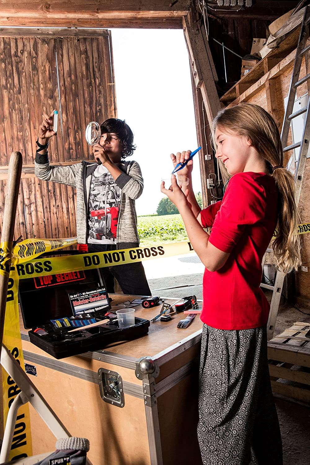 ["Detective Equipment - The practical case for young detectives with numerous ideas for creative role-playing with the three ???", "Crime scene investigations - Young detectives can use the extensive crime scene tools to take fingerprints, pass on encrypted messages, and analyze evidence.", "Promotes creativity - Through role-playing, children unleash their ingenuity and imagination. Develops an eye for details and memory.", "With expert tips - The extensive accompanying booklet contains numerous explanations and tips from Justus, Peter, and Bob, offering exciting investigative cases.", "Contents: UV lamp, invisible ink pen, magnifying glass, fingerprint powder and film, professional brush, fingerprint card, barrier tape and measuring tape, plaster casting set, stamp pad, crime scene notepad, chalk, tweezers, laboratory equipment (petri dish with lid, test tube, sample container, measuring cup), evidence bags, code discs, stickers, detective ID, door sign for the detective office, Detailed instruction book with many tips and cases to solve"]