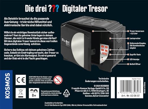 The Three Investigators Digital Safe from KOSMOS. Protect your secrets with a code and voice alarm. Detective toy set for kids aged 8 and up. Mini safe.