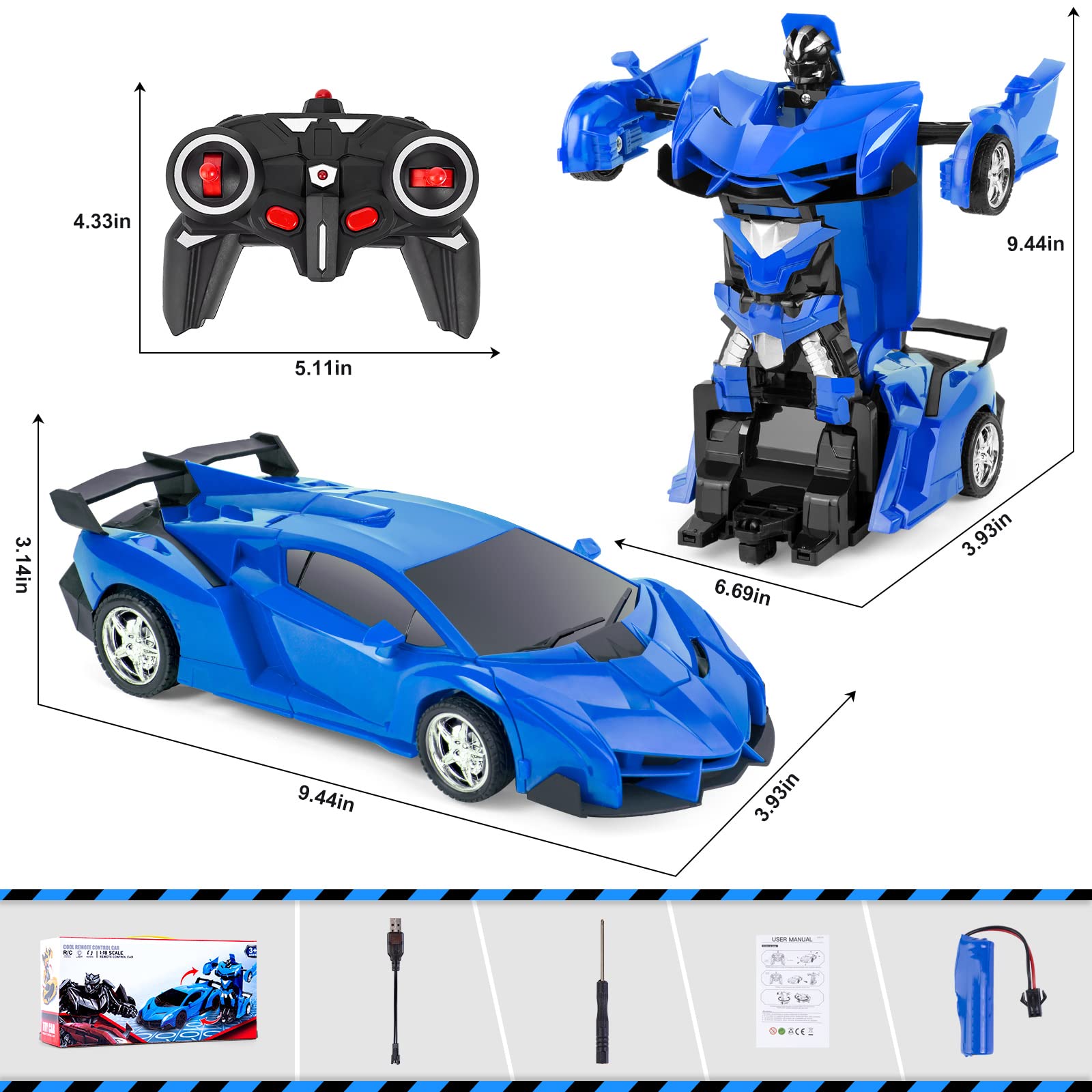 ["🚘【Safe Materials】Input: 5V. This remote-controlled Transform Car is made of high-quality ABS plastic, safe and non-toxic, durable anti-drip materials, absolutely safe for children.","🚘【2 in 1 Transformer Car】Car and robot are integrated into one. 1:18 remote-controlled deformation car, can be used not only as a remote-controlled car, but also transformed into a robot. The car model and the robot model are easily transformed.","🚘【Intelligent RC Car - 360° Rotation】The remote-controlled cars for kids can flexibly rotate 360°, with 4 smooth wheels moving in all directions - left, right, forward and backward, with the remote control, in the form of a robot and car.","🚘【Rechargeable Batteries】The remote-controlled car is equipped with a rechargeable battery and a USB charging cable, it can be conveniently charged, has a large battery capacity, is durable and suitable for indoor and outdoor play.","🚘【Great Gift for Kids】Perfect transformer car toy for children aged 3 and up. A great gift for boys and girls for birthdays, Christmas, or other occasions. 3 colors to choose from, choose the best for kids, give them a wonderful memory."]