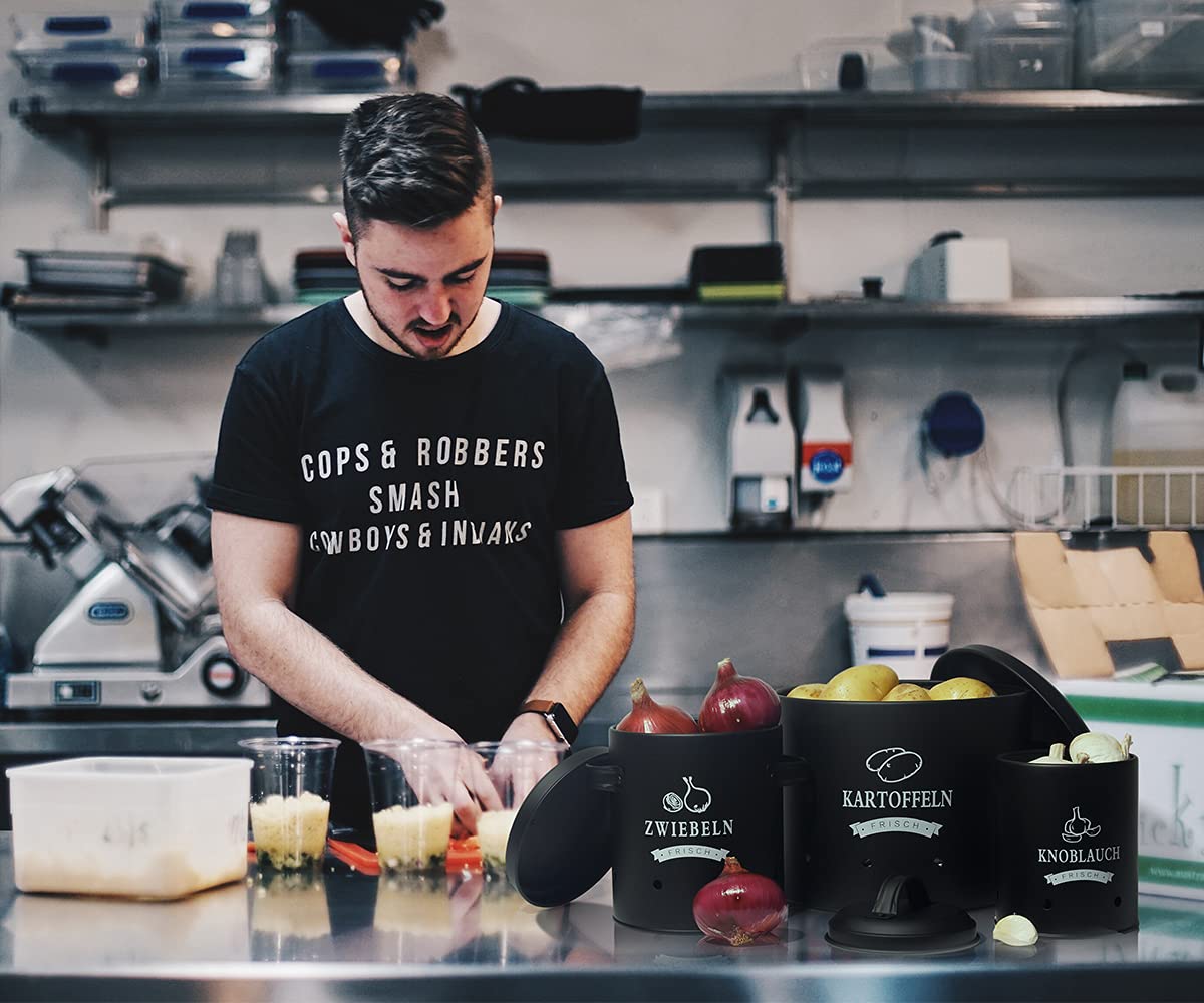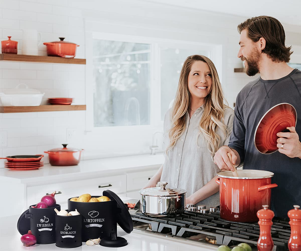["LONGER STORAGE: Small holes in the container can reduce air circulation, prevent bacteria growth, and keep potatoes, onions, and garlic fresh for longer.","ENOUGH SPACE: Three types of containers can store all kinds of food. Potato pot (D.23cm * H.23cm) can hold up to 4 kg of potatoes, onion pot (D.14cm * H.19cm) can hold 1.5 kg of onions, garlic pot (D.11cm * H15cm) holds 12 bulbs.","PRACTICAL: Each storage container has a lid to avoid oily smoke. Handle on the container makes transportation easier.","TIMELESS DESIGN: Classic retro look with unique charm. It is the best choice for friends and family.","STRONG AND STURDY: Made of high-quality steel sheet, can withstand multiple falls without damage."]