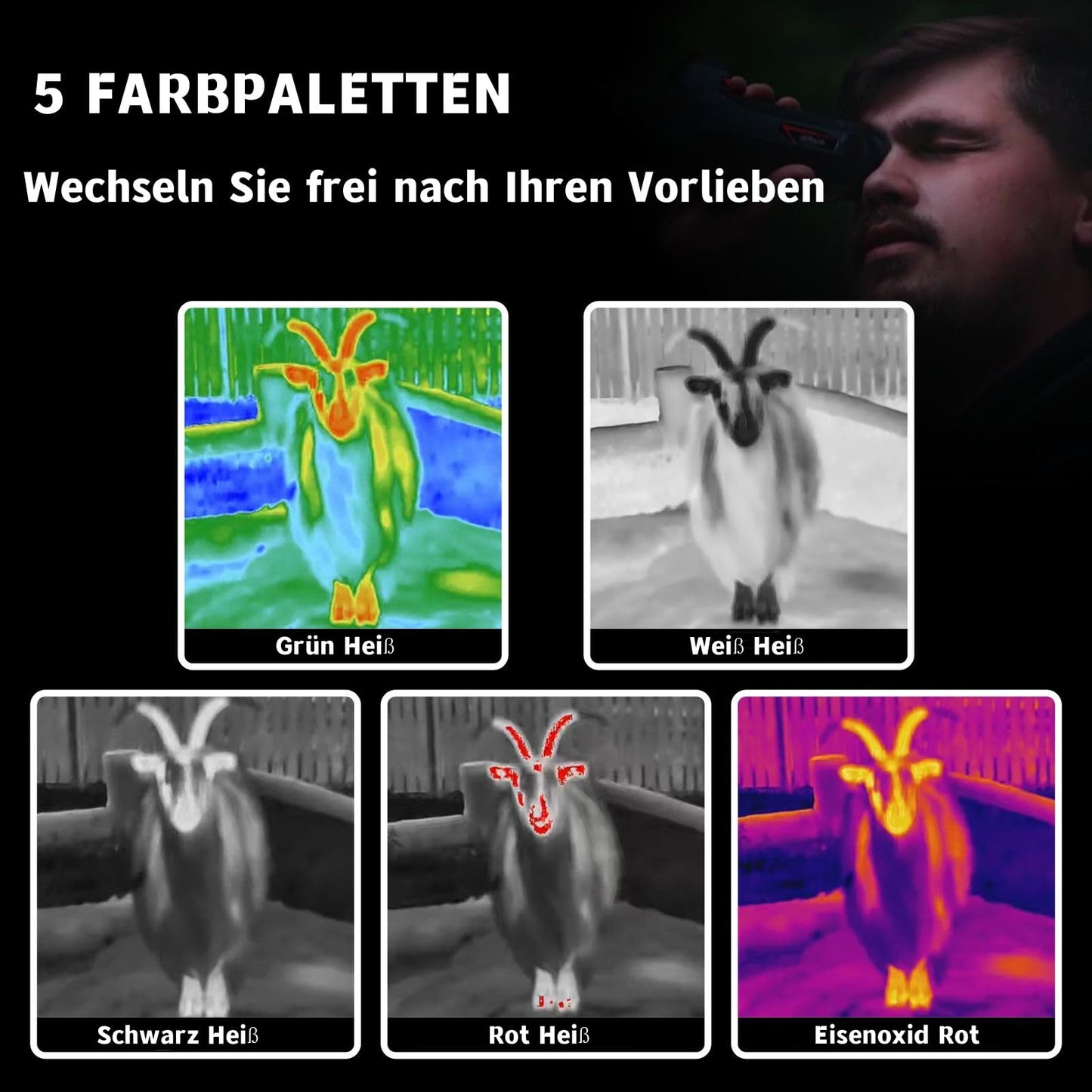 "4 display modes & automatic distance display - The color palette of this thermal imaging device offers 4 display modes - Warm White, Warm Black, Warm Red, Warm Iron Oxide. Simply mark the top and bottom of a target on the screen with the convenient distance measurement function, and the user interface will automatically show the distance from the target to the thermal imaging device, helping hunters identify objects faster and more accurately.",