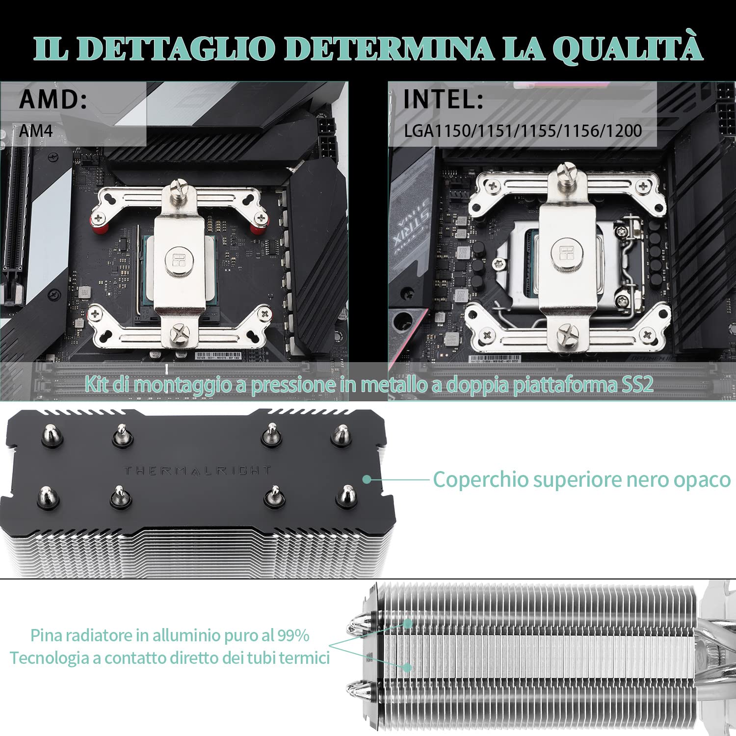 ["Thermalright is a Taiwanese brand with over 20 years of development. It has a certain popularity in domestic and foreign markets and has a significant influence on the gaming market. The R&D product lines include: air-cooled CPU coolers, case fans, thermal silicone pad, thermal silicone grease, CPU fan controller, anti-drop mounting bracket, support bracket, and other goods","Thermalright AX120 SE; CPU cooler dimensions: 125 (L) x 71 (W) x 148 (H) mm (4.92 x 2.8 x 5.83 inches); Product weight: 0.645 kg (1.42 lb); Heatsink material: Aluminum, CPU cooler is equipped with metal fittings of Intel and AMD platforms for better installation","PWM fan TL-C12C; Standard size PWM fan: 120 x 120 x 25 mm (4.72 x 4.72 x 0.98 inches); Fan speed (RPM): 1550 RPM ± 10%; Power connector: 4pin; Voltage: 12V; Airflow: 66.17 CFM (MAX); Noise level ≤25.6 dB(A), the fan combines efficient cooling with low noise level, providing you with an environment of both efficient cooling and true peace","AGHP technology 4 × 6mm heatpipes apply AGHP technology. Solve the reverse gravity effect caused by vertical/horizontal orientation,Up to 20000 hours of industrial life ensures S-FDB bearings provide long-lasting life for air cooler radiators. UL Class a safety insulation inferior, PBT + PC material to produce high quality products for you. The height is 148 mm, suitable for mid-sized computer cases","Compatibility CPU cooler socket supports: Intel:115X/1200/1700/17XX AMD:AM4; For different CPU socket platforms, corresponding mounting plates or brackets are included"]