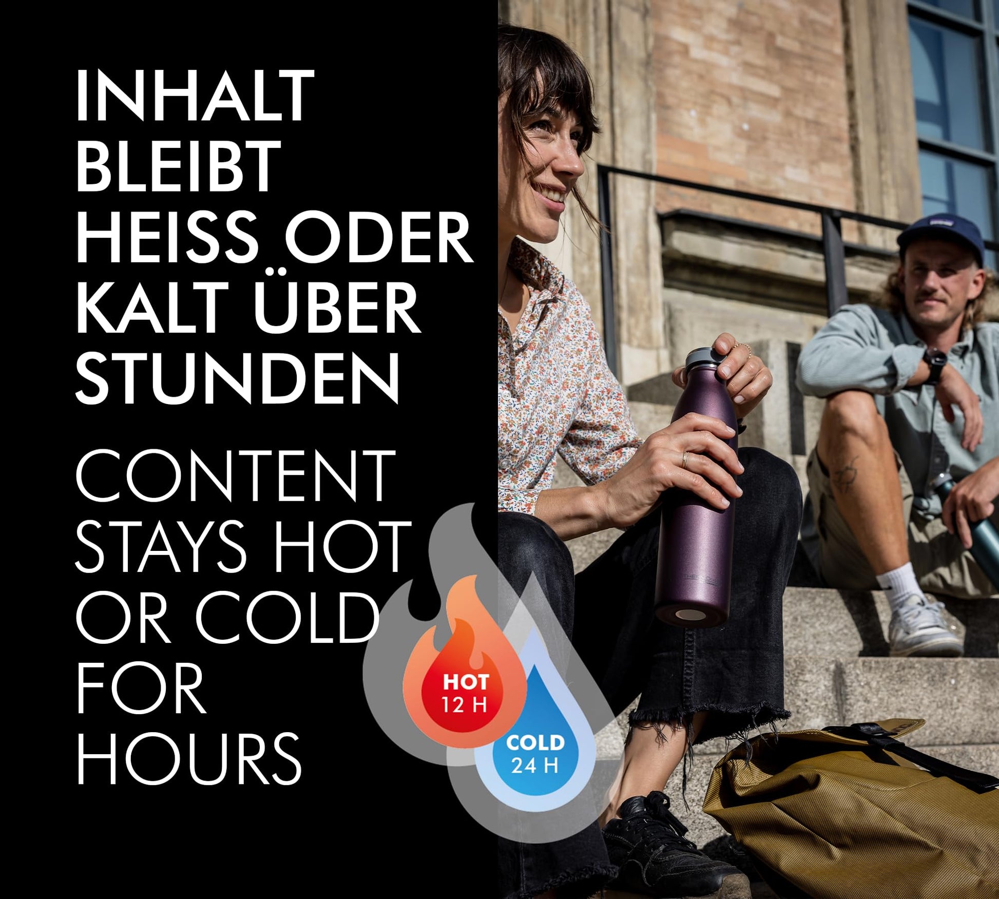 IDEAL FOR ON THE GO: The double-walled thermos bottle is light and slim – perfect for any bag. The rubberized twist cap ensures easy opening without slipping.