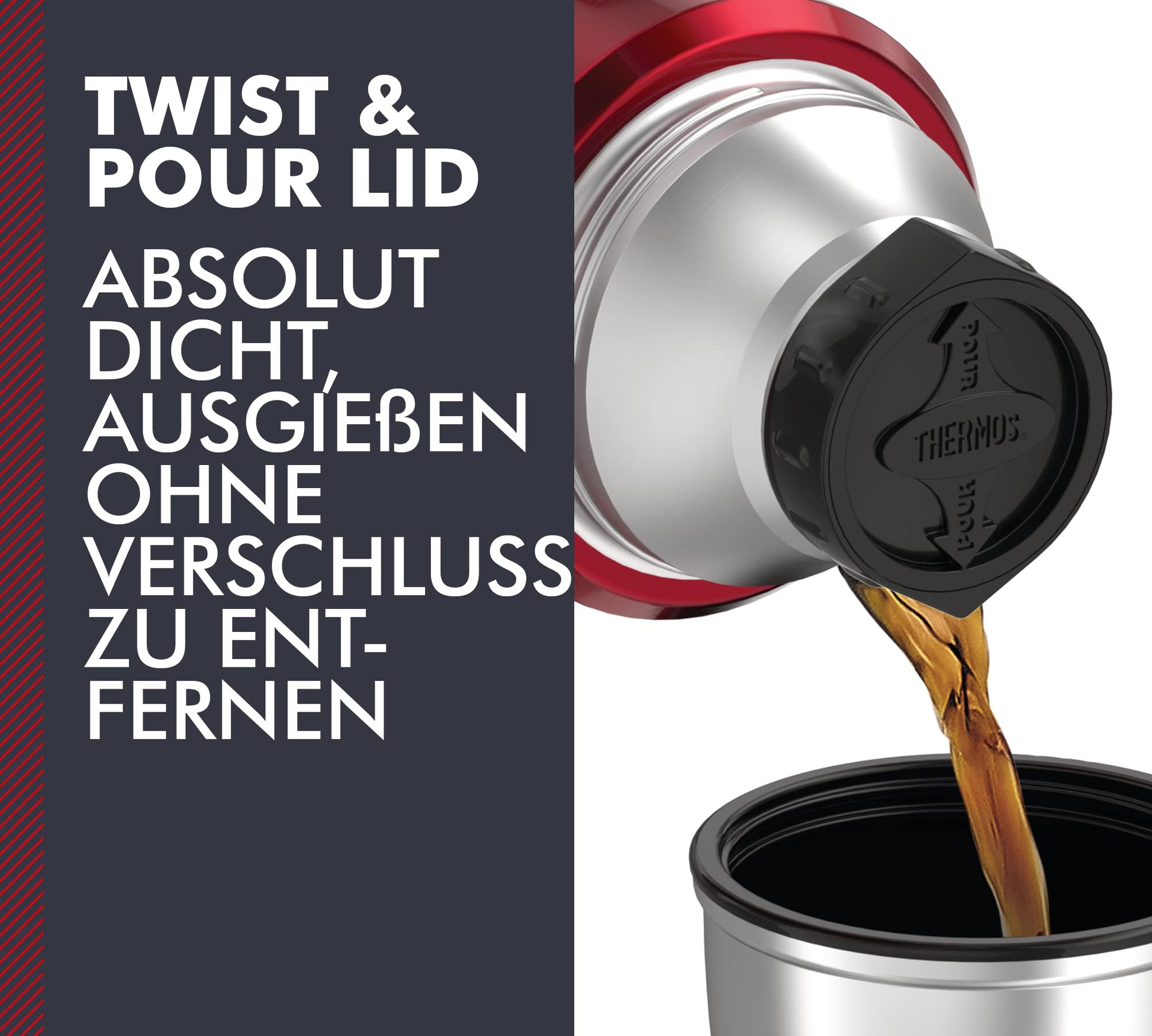 "READY FOR USE ANYWHERE: Like freshly brewed! With THERMOS insulation performance, the contents stay reliably hot or cold for 24 hours. Safe to touch from the outside."