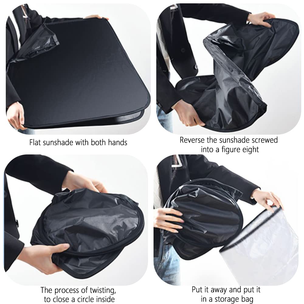 ["【Thicker Design】: The latest thicker car sunshade windshield in 2024! More Sun Protection! Our car sun visor is designed with 240T thickened titanium silver coating, which can strongly block the sunlight and heat, allowing you to enjoy the cool and quiet time alone in your car in the hot summer sun!","【UV Blockade and Heat Insulation】: This car sunshade has strong sun protection and heat insulation functions! It can block and reflect 99% of UV rays. Its heat-insulating and cooling effect is 60 times more effective than conventional sun protection films! Create a cool and pleasant driving atmosphere!","【Repeatable Foldable Windshield Sunshade】: The car windshield sunshade is designed with a "Memory Steel Ring" that can be freely twisted and folded when you want to store it. Simply fold it together, twist it along the steel ring into an "8" shape, and place it in the storage bag that comes with the product. It can be easily placed in the car door or passenger compartment.","【Compatible Models】: Our windshield sunshade is suitable for 99% of car models and is available in two sizes. M: 140x70cm: for normal family cars, SUVs, etc. L: 145x80cm and XL: 150x80cm: for medium to large vehicles, SUVs, etc. Please carefully measure the size of your car windshield before purchasing.","【Installation】: The installation of this windshield sunshade is very easy. Method 1: You can use the elasticity of the visor and place it directly in front of the car windshield. Method 2: You can also use the two sun visors that come with the original car to push and secure it. The installation only takes a few seconds and is really easy to handle."]