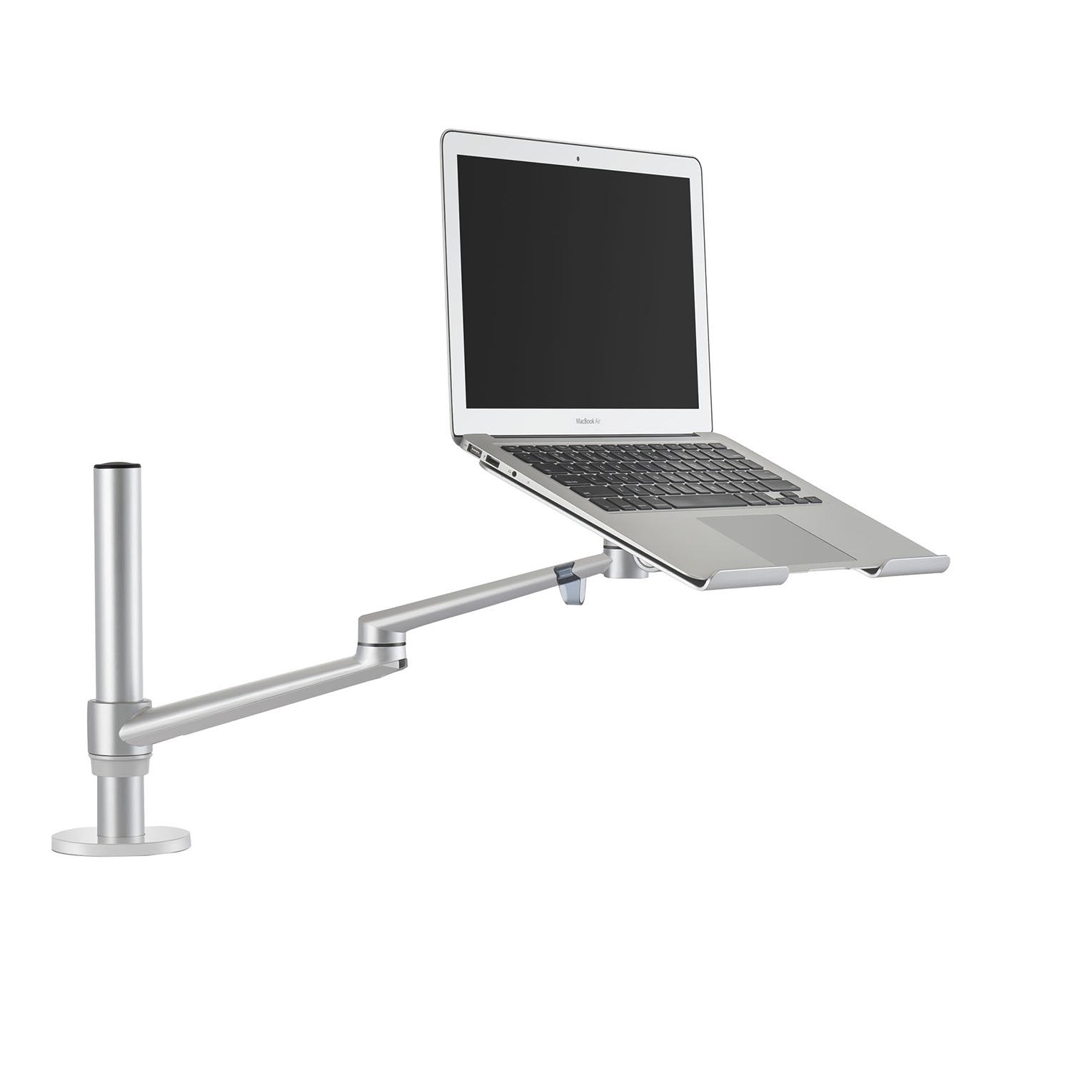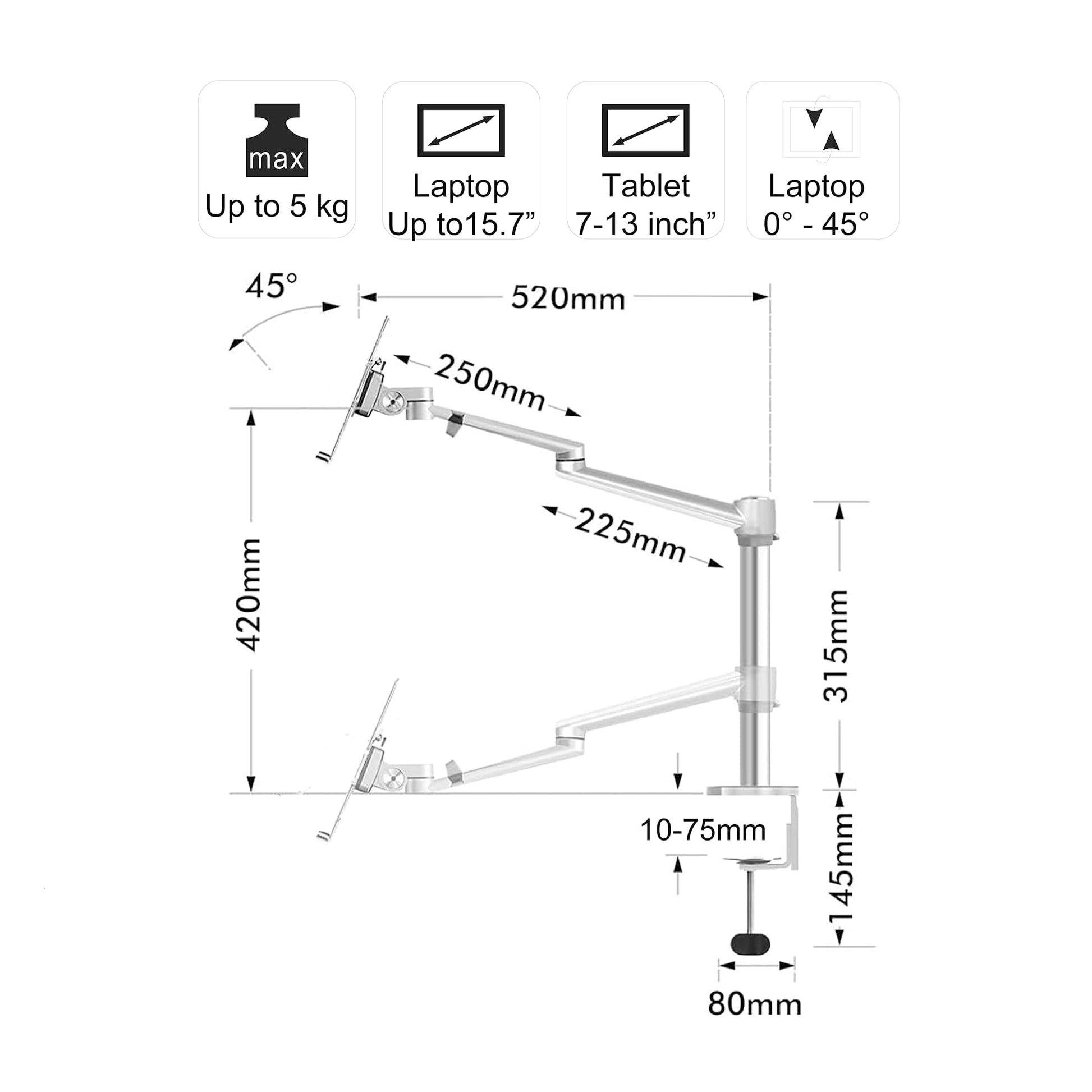 Arm Flexibility: Arm easily adjust to support an ergonomically correct workstation; sit more comfortably at your desk while reducing neck, eye and back strain, height adjustable to 16.73 inches and provides up to 19.68 inches of arm extension. The design also allows 25° of tilt and 360° of swivel movement for laptop mount, and 80° of tilt and 180° of swivel movement for tablet mount.