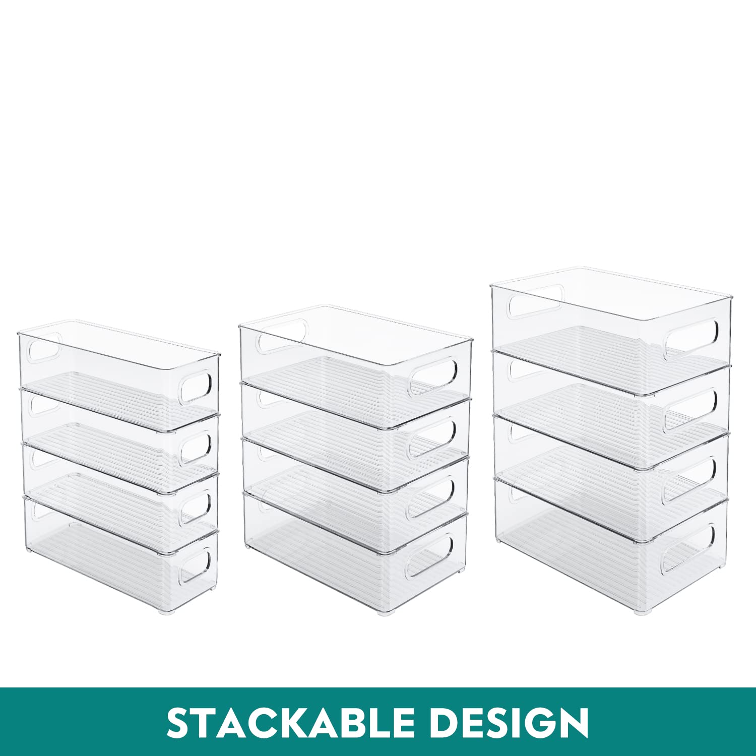 ["✮ REFRIGERATOR ORGANIZER 12-PIECE SET - This set of refrigerator storage boxes includes 4 Upgraded Large, 4 Medium, and 4 Small. The size of each Upgraded Large transparent drawer is 10.43 x 6.50 x 3.46 inches, Medium is 10.24 x 5.91 x 2.95 inches, and the Small is 10.04 x 3.94 x 2.95 inches. These 3 sizes of boxes are stackable.",