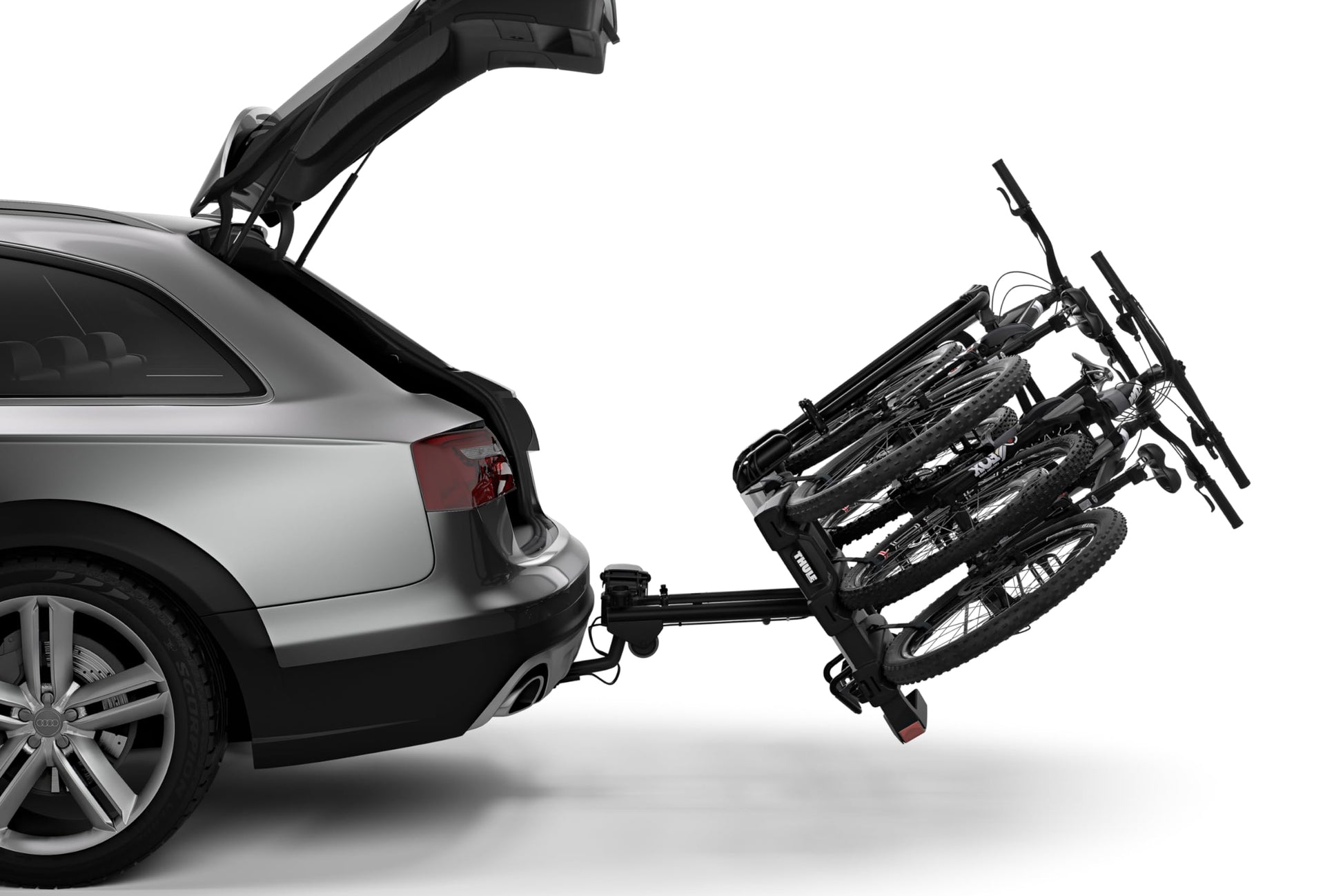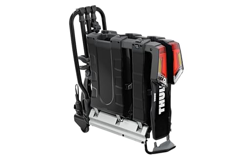 ["Completely foldable for easy assembly, handling, and storage","High load capacity allows for transport of e-bikes and heavy mountain bikes","Easy mounting of bikes with removable bike arms featuring lockable Thule AcuTight torque limit knobs that click when optimal torque is reached","Wide spacing between wheel holders ensures smooth bike transport","Extra-long wheel straps with ratcheting function allow for easy attachment of wheels (up to 4.7 inches wide), enabling transport of fat bikes","Convenient tilting mechanism with foot pedal provides easy access to the trunk, even with bikes on the carrier","Simple assembly and adjustment of the bike carrier before closing the clamping lever thanks to a secure connection to the trailer hitch","Ergonomic transport of the bike carrier with integrated transport wheels and carrying handles","Pre-assembled, no tools required","Secure your bikes to the bike carrier and the carrier to the trailer hitch (locks included)"]