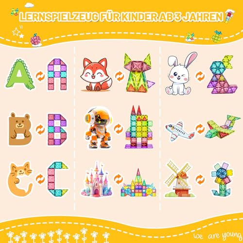 ["3D Magnetic Toys: 120 pieces of magnetic toys have a special 3D design, more dimensional and lively, more interesting than ordinary flat toys, the magnetic blocks are equipped with large 0.83-inch magnets. Compared to ordinary magnetic blocks, our magnets ensure a secure connection, allowing more complex shapes to be built without collapsing.","STEM Toy: With this magnetic toy, dogs, rabbits, foxes, castles, dinosaurs, cars, and other everyday objects can be built to stimulate children's interest and creativity and help them better understand the world, ideal for families, kindergartens, and daycare centers.","Safe and reliable magnetic toy: Our magnetic toy is made of ABS plastic, has a double-weighted firm seal, rounded edges to ensure the safety of small hands, and the most advanced ultrasonic welding technology to avoid defects.","Magnetic Toy 120-piece Set: This set consists of a total of 120 pieces, 8 isosceles triangles, 26 equilateral triangles, 10 right triangles, 28 square rows, 8 rectangles, 8 square disks, 8 polygonal squares, 8 four-sided squares, 8 door squares, 8 two-sided square rows, and 8 E-zags.","Suitable Educational Toy: Suitable for children over 3 years old, you can explore / patchwork the world with your little friends / parents / teachers to increase the moments of parent-child interactions, perfect as a preschool educational toy and companion toy, even if parents are busy, this magnetic toy can accompany children to have fun and play happily."]