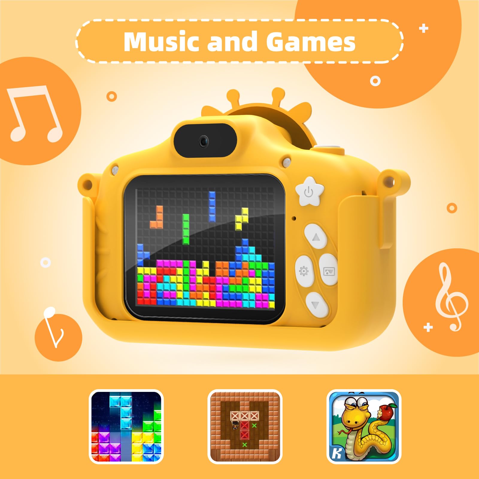 ["[20MP Dual Lens & 1080P Video Recording] This TIATUA kids camera is equipped with an upgraded 20MP front and rear dual lens, which shows a greater improvement in pixel compared to previous models, allowing kids to capture high-resolution color images and record 1080p videos in high resolution. At the same time, this kids camera also supports a self-timer mode, allowing for more angles to be discovered.","[Multi-Function & 32GB Card Included] The TIATUA kids camera features a unique giraffe design, various cartoon frames, and filter effects for extra fun while taking photos. It also has practical functions such as self-timer, continuous shooting, time-lapse, 8x zoom, games, MP3, etc. No more worries about storage space thanks to the included 32GB card.","[More Safety Considerations] The TIATUA kids camera is made of non-toxic silicone that complies with international toy standards. It is sturdy against accidents and collisions. For the safety of children, we have also built in an adjustable hand strap to make carrying easier and avoid the risk of choking from the strap.","[Large Capacity Battery & Long-lasting Fun] This digital camera for kids is equipped with a 2.0-inch IPS HD display and a 1000mAh large battery. A single charge is enough to support 4 hours of continuous shooting or 2 hours of video recording, making it a great companion for your child's outdoor trips. Note: The product comes with a USB charging cable, but no charger.","[Ideal Toy Gift for Kids] Once, we captured the beauty from the eyes of adults with our lens. We truly hope that kids can use a camera to capture the beauty from their own eyes. Every childhood is precious. Ideal gift for birthday/Christmas/holiday/daily gift for girls and boys aged 3 4 5 6 7 8 9 10."]"