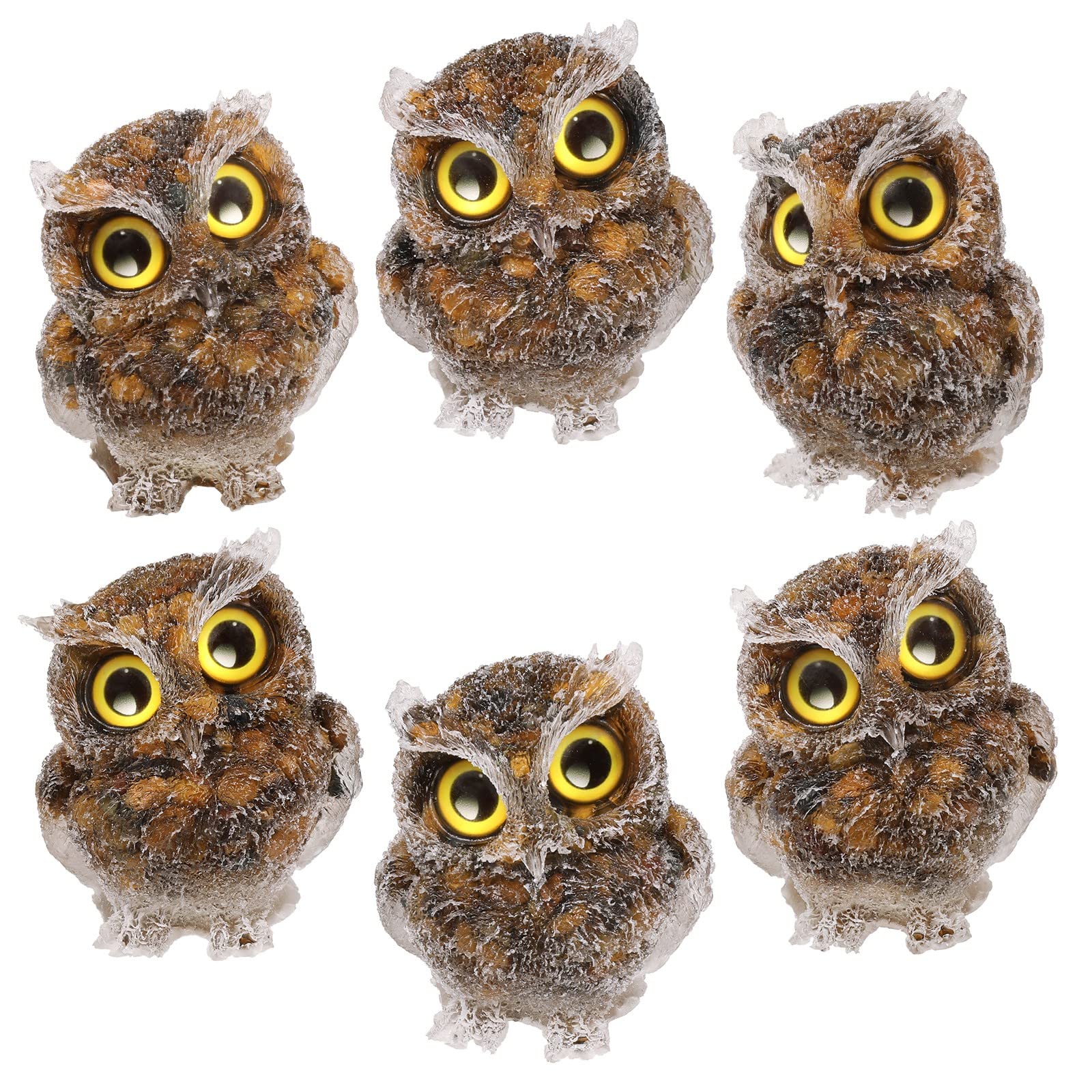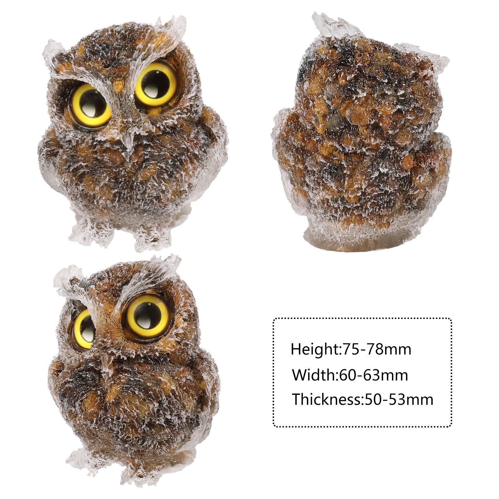 ["Cute Stone Owl Statues: The crystal owl figurine is exquisitely designed with lovely textures. There are crystal stones in the resin, energetic and beautiful. The bright glass eyes give these cute figures fine details and make them very lifelike. Since each stone owl ornament is handcrafted from natural crystal, the size, color, and texture of the product you receive may vary slightly from the photo.", "Mini Stone Owl Sculptures Size: Resin owl statue height: 2.9\"-3.07\" (75mm-78mm), width: 2.36\"-2.48\" (60mm-63mm), thickness: 1.97\"-2.09\" (50mm-53mm), weight: 160-200g/pc. Package includes: 1x crystal owl sculpture ornaments, 1x KYEYGWO gift bag, 1x gift box.", "Feng Shui Owl Figures: Owls have keen eyesight, allowing them to see well in the dark. The owl is a symbol of wisdom, strength, and guidance. The owl signifies that everything will be fine, bringing luck and best wishes, it is a great amulet and good luck charm.", "Crystal Owl Statues Desktop Decoration: The crystal owls look wonderful displayed on a bookshelf, TV stand, desk, dresser, mantelpiece, tabletop, and windowsill. You can also place them on your flower pot, micro landscape, crystal garden, or aquarium. This will make your space interesting and full of life. Additionally, they can also be used for animal party decorations to have hours of fun.", "Healing Crystal Figure The crystal bird figurine can absorb the negative energy around it and is a good tool for Reiki healing, meditation, yoga, and chakra balancing. It can help reduce stress and eliminate negative emotions. The mini stone animal sculpture is also a good gift for parents, relatives, friends, and couples."]
