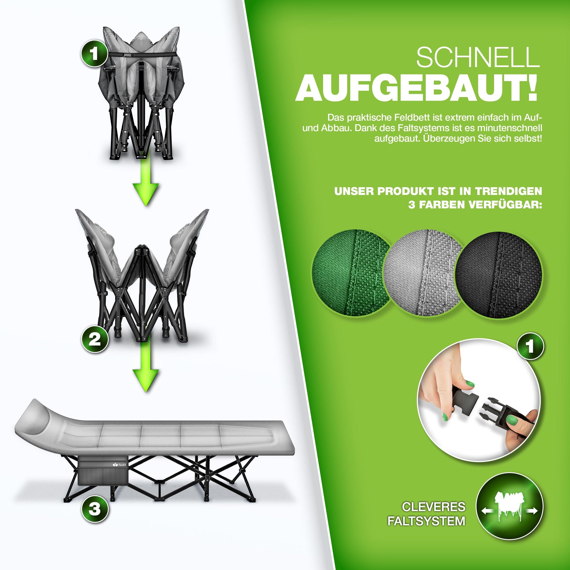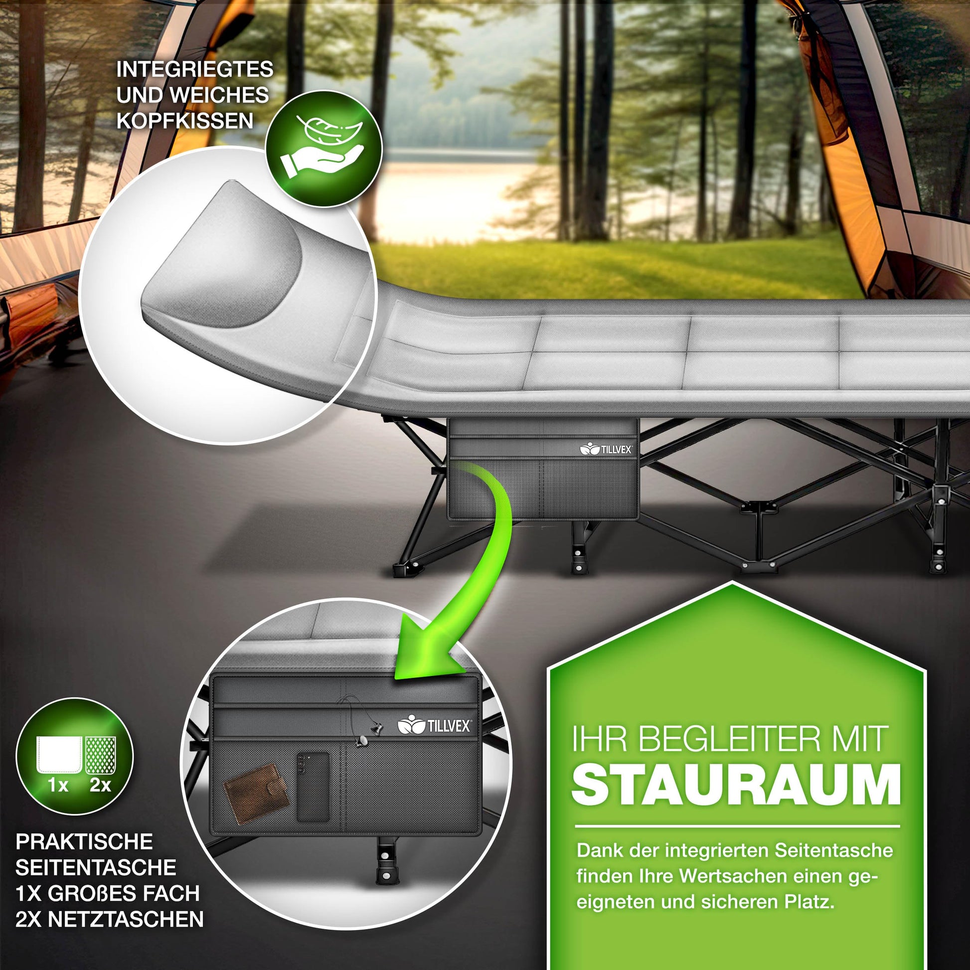 ["SOFT HEAD PILLOW: Our tillvex camping cot is equipped with a super soft pillow that is integrated into the cot. This practical design saves you the trouble of disassembling the pillow and ensures uninterrupted rest. The integrated head pillow increases comfort and allows you to better enjoy your relaxation time. This thoughtful feature makes the camping bed perfect for the garden, balcony, terrace, travel, camping, beach, or as a guest bed.","EASY SETUP: The cot is lightweight & foldable, requires no assembly, and can be set up within 10 seconds or folded into the included storage bag. This carrying bag makes transportation easier and makes the folding bed ideal for indoor & outdoor use such as hiking, festivals, or as a guest bed. The sun lounger is foldable, saving you time and effort, allowing you to focus more on your adventures.","STURDY STEEL FRAME: The durable steel frame of our garden cot is made of heavy-duty steel tubes with an X-shaped structure. This construction ensures a maximum weight capacity of up to 200 kg, supporting even robust adults safely. The non-slip plastic caps on the legs provide additional stability and prevent slipping, even on uneven surfaces. Trust in the strength and reliability of our carp cot.","PRACTICAL SIDE POCKET: The tillvex recliner also serves as a fishing bed, angling bed, or carp cot. The sleeping cot is equipped with a large side pocket where you can store your phone, water bottles, or other personal items. This convenient pocket allows you to have important items within reach without having to get up.","HIGH-QUALITY MATERIAL: Our travel cot with pad is made of durable cotton and Oxford fabric, which is washable and easy to clean. This material not only provides high comfort but is also resistant to wear. The sturdy construction of the cot, supported by reinforced metal tubes, ensures a long lifespan and reliability."]