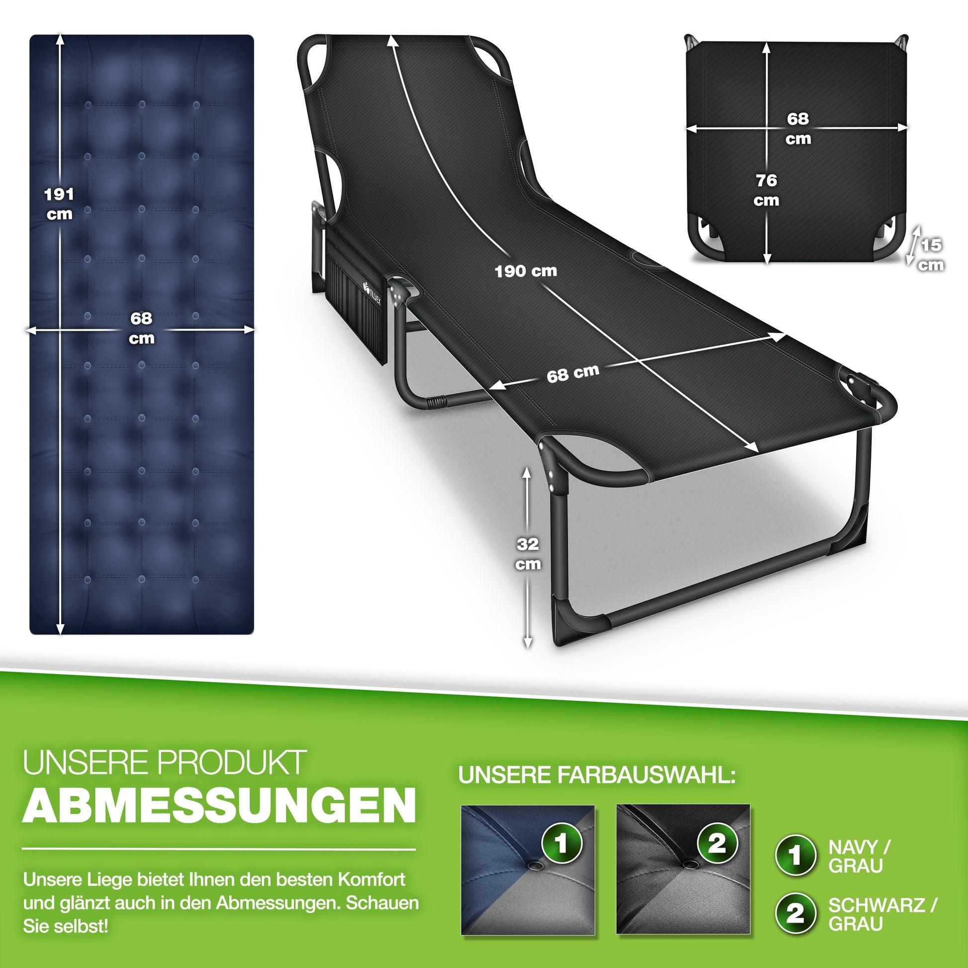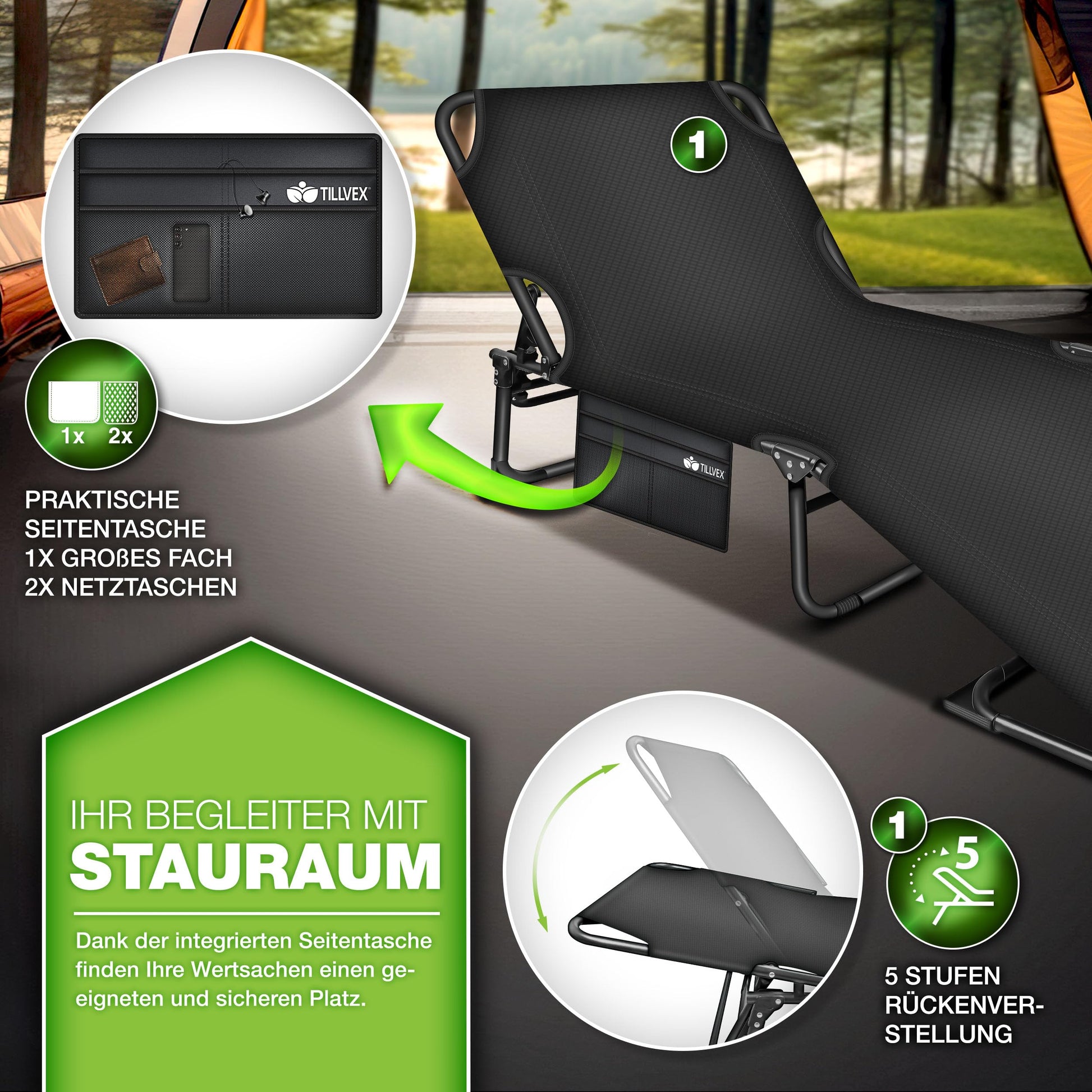 tillvex® Folding camping bed with neck pillow & side pocket up to 280 kg | Camping lounger sun lounger with padding | Field bed outdoor & indoor | Folding bed guest bed foldable garden camping festival travel
