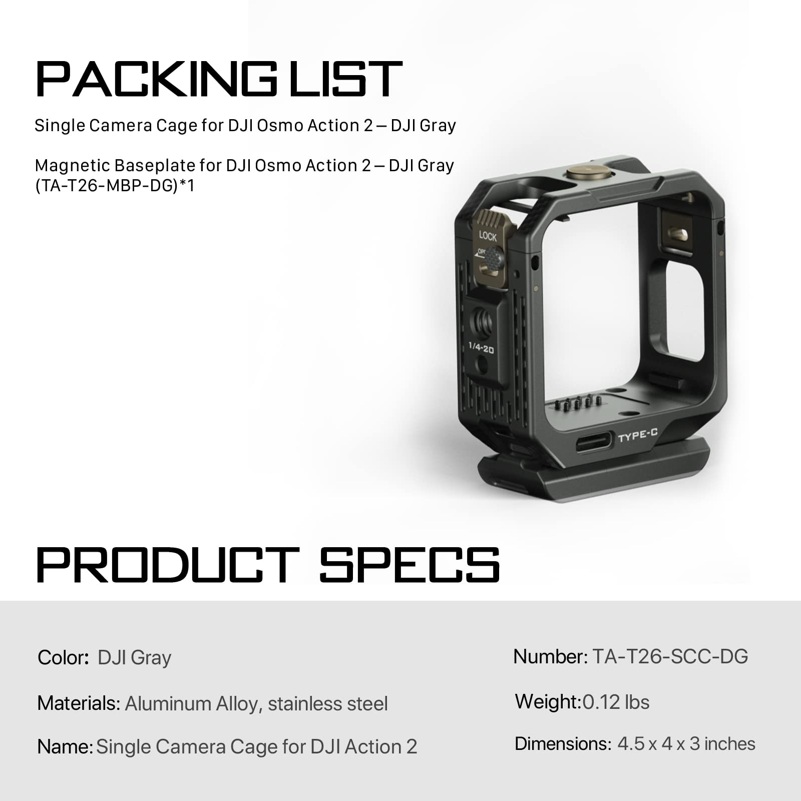 Tilta Single Camera Cage, compatible with DJI Osmo Action 2 Video Making Rig, with magnetic baseplate - Gray TA-T26-SCC-DG
