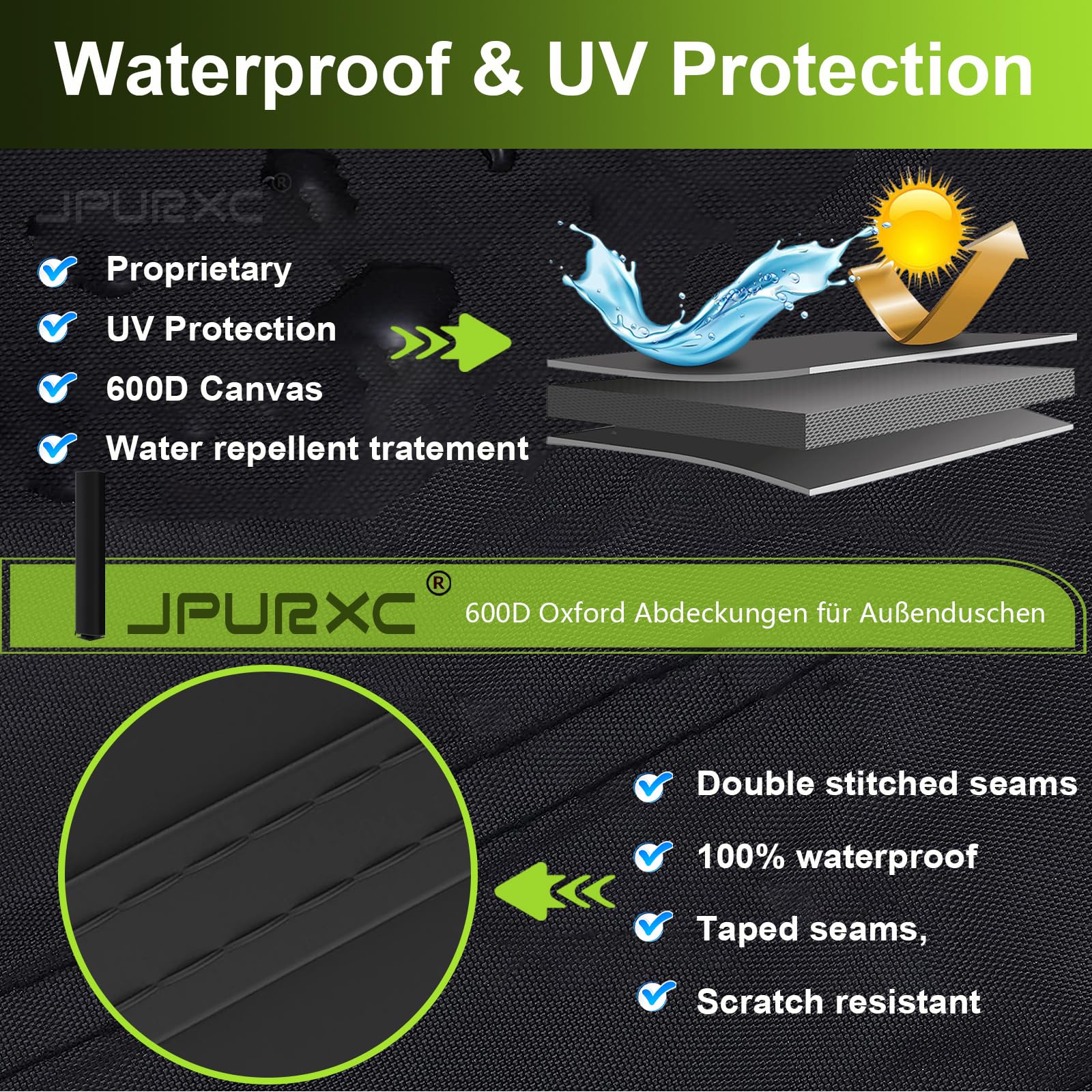 Tinsel covers for outdoor showers, heavy-duty 600D Oxford cover for solar shower with UV and PU coating and high tear resistance, with drawstring and storage bags (220x67cm)