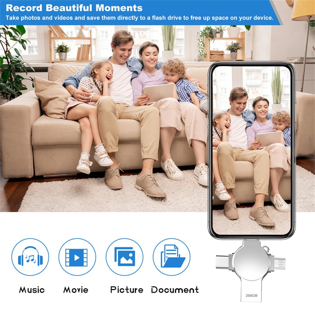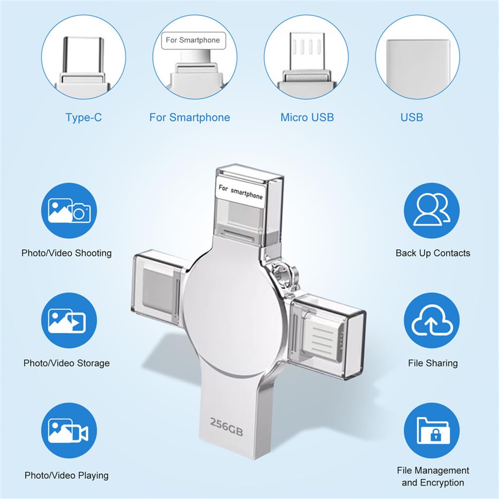 Tioreint USB Flash Drive 256GB USB 3.0 Memory Stick 4 in 1 Metal Photo Stick USB Drive Mobile External Storage for Smartphone Computer Laptop OTG Android PC Pad