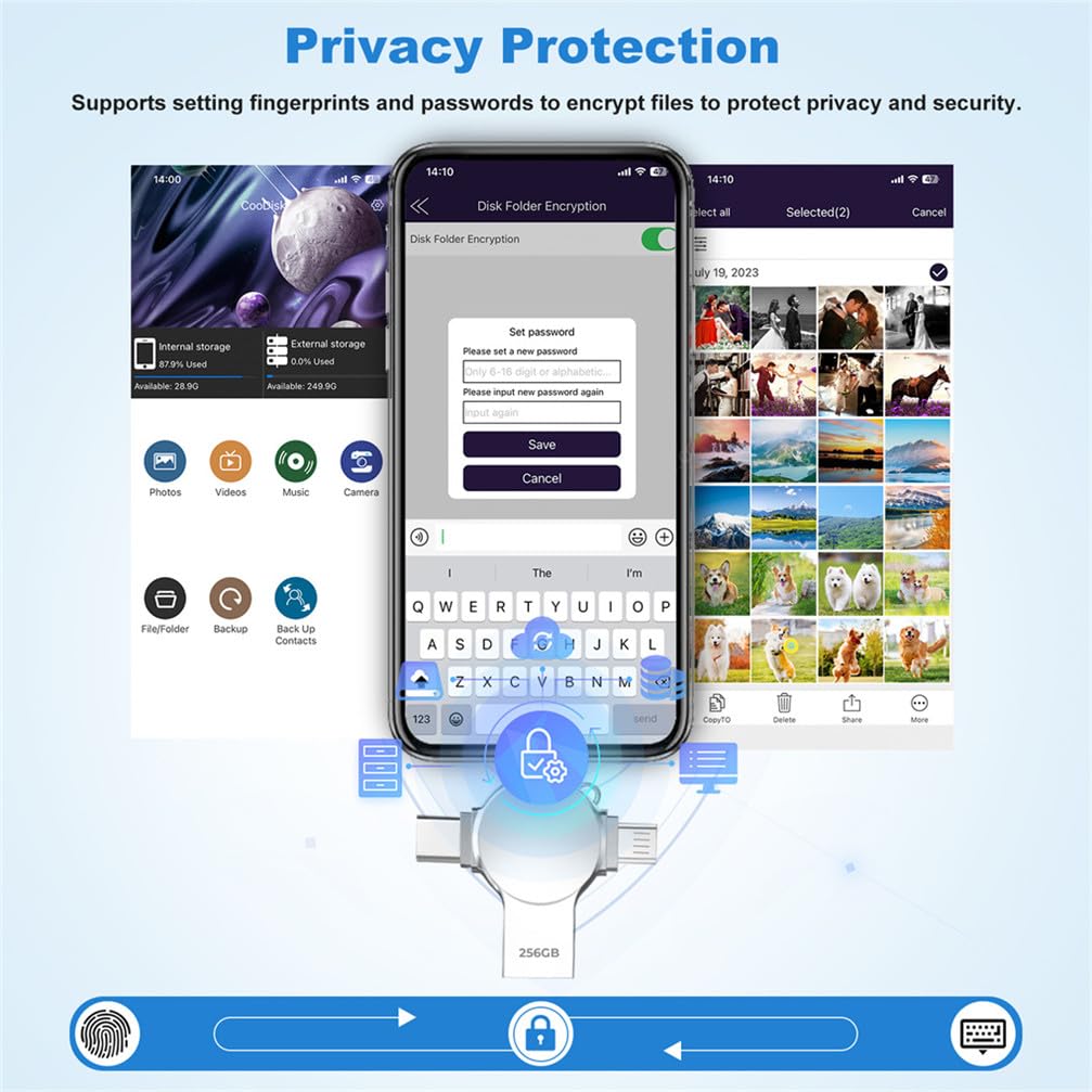 ["Broad Compatibility: USB stick is equipped with multiple connector models, including iOS port + Micro USB + Type C port + USB 3.0 port. No additional adapter is required, compatible with most devices on the market such as computers, iOS devices, Android phones, tablets, and more. You can easily transfer files such as photos, documents, and videos between different devices.","Fast and Stable Transfer: With the updated USB 3.0 flash drive, you can read, write, and transfer data without delay. With the One-click Backup function, you can quickly free up storage space on your device. With just one click, photos, videos, and documents can be quickly backed up on the drive, greatly improving work efficiency.","256GB Capacity: With 256GB of additional storage capacity, you can easily cover the storage needs for photos, music, videos, and files in daily work, life, and school. Note: To use this USB stick with iOS devices, you need to download the "CooDisk" application from the App Store; For Android devices, you do not need to download an app, just enable the OTG function.","Data Protection and Security: 256GB flash drive supports setting Touch ID or digital password to protect your private files. Encrypted files are not visible on the computer. You can easily share data with others without worrying about private files being stolen. You can freely choose whether to encrypt some files or the entire USB stick.","Plug and Play: After plugging in the stick, you can directly view the movies and videos stored on the USB stick. Or you can record the wonderful moments of life with the in-app camera, save them directly on the flash drive, and share them on social media with one click. Capture life and share it anytime and anywhere."]